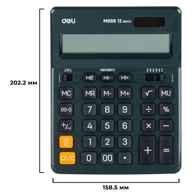 Калькулятор настольный Deli EM888F-green зеленый, дисплей: 12-разрядный, однострочный, монохромный, питание батарея х 1шт.