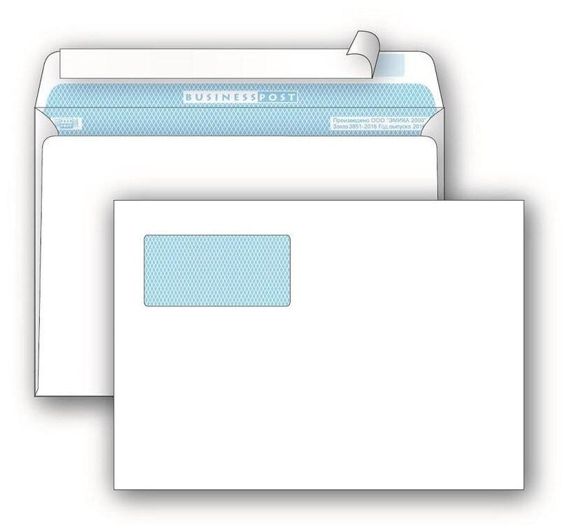 Конверт BusinessPost C4 100 г/кв. м белый стрип с внутренней запечаткой с левым окном (250 штук в упаковке) 229х324 мм с окном 55х110мм расположенным в левом верхнем углу. Месторасположение окна (отступы в мм): слева - 25 мм, справа - 189 мм, сверху - 30 мм, снизу - 144 мм. Выполнен из офсета 100 г/кв. м, имеет клеевое нанесение типа стрип (отрывная силиконовая лента). Предназначены для пересылки 50 листов А4 формата, что равно 250 г веса. Упакован 250 штук в коробке. Срок годности не ограничен. Показатель белизны бумаги - 143-149 %.
