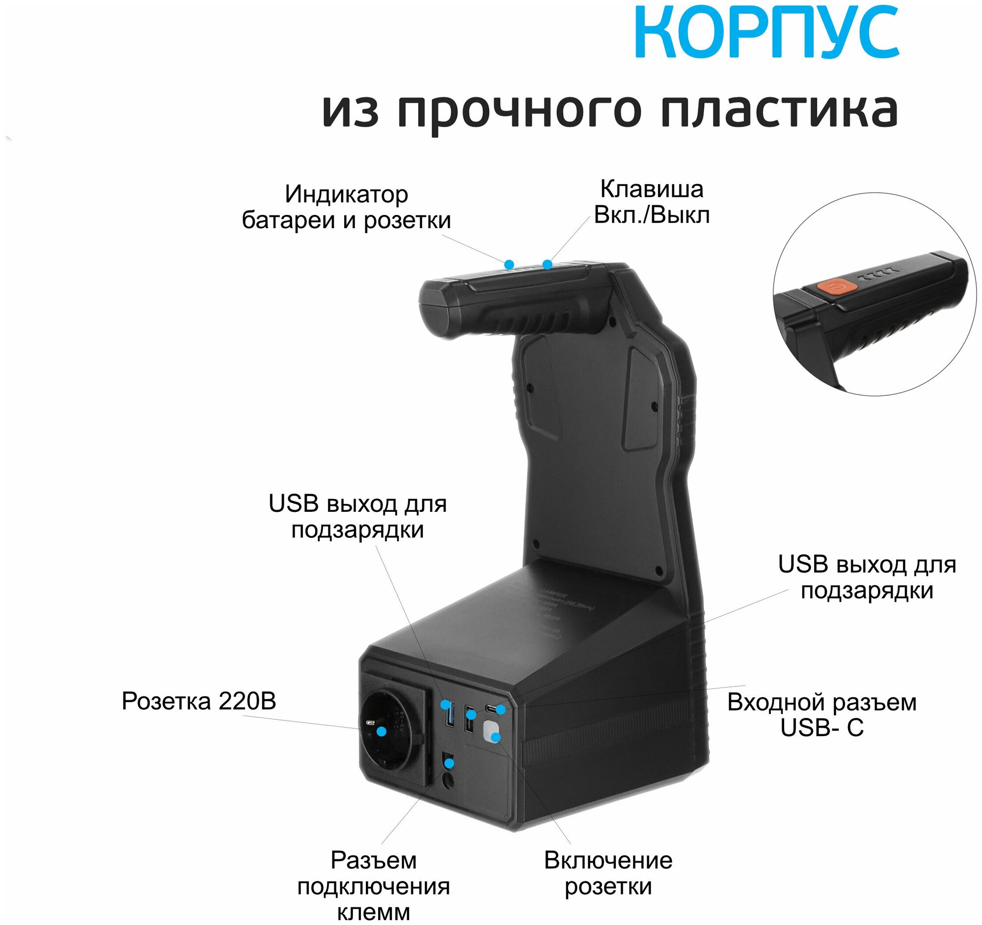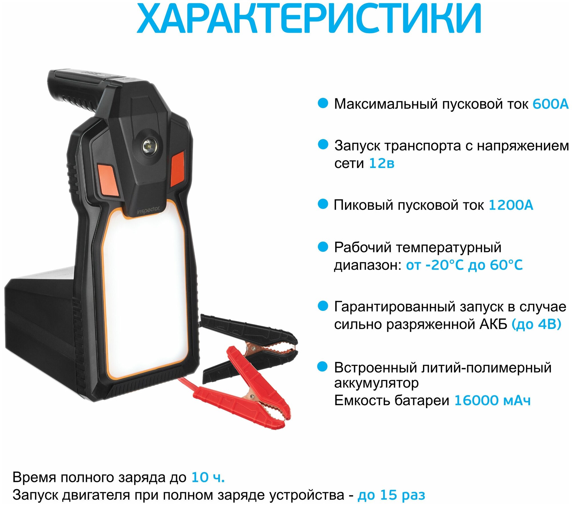Inspector Camper - многофункциональное пуско-зарядное устройство (ПЗУ) предназначено для экстренного запуска двигателя автомобиля в случае недостаточного заряда аккумулятора, а также выполняет функцию зарядного устройства для широкого спектра портативной электроники (планшеты, смартфоны, беспроводные наушники и др.), включая встроенную розетку 220В для питания различного рода устройств суммарной мощностью до 120 Вт. Inspector Camper обладает пусковым током 600А, что обеспечивает запуск любых типов транспортных средств с бензиновым двигателем объемом до 7 л. и с дизельным двигателем до 5 л, а также функцией автоматического выключения для сохранения уровня заряда устройства. - полная зарядка самого устройства от сети происходит в течение примерно 10 часов; - устройство способно полностью зарядить современный смартфон около 3-4 раз; - количество пусков двигателя при полном заряде устройства – около 15 раз; - срок службы устройства – 3-5 лет при соблюдении правил эксплуатации; - устройство способно произвести запуск двигателя в течение 6-12 месяцев с момента полной зарядки устройства.