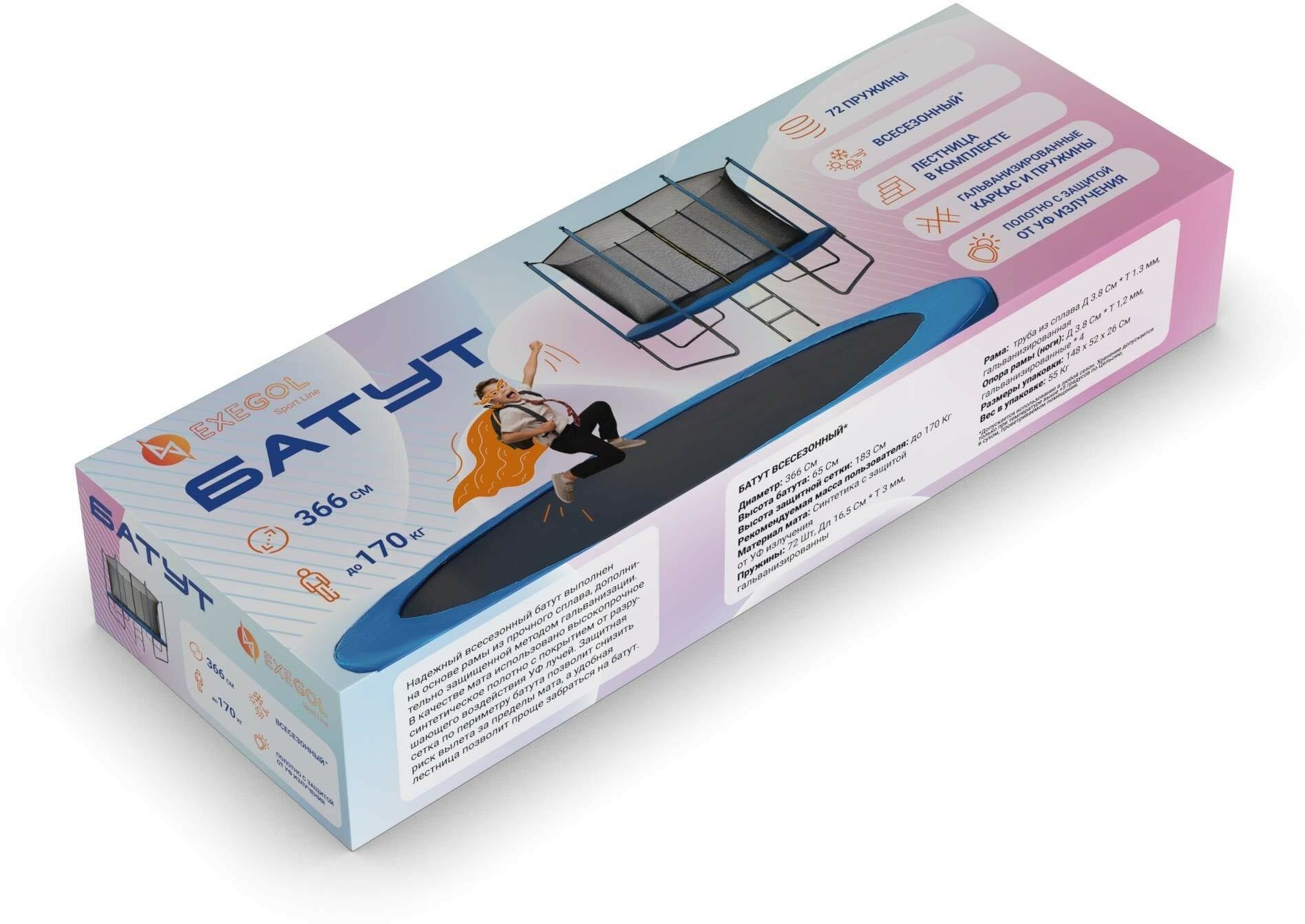 | Описание | Надежный всесезонный батут, выполнен на основе рамы из прочного сплава, дополнительно защищенного методом гальванизации. В качестве мата использовано высокопрочное синтетическое полотно с покрытием от разрушающего воздействия УФ лучей. Лестница в комплекте |