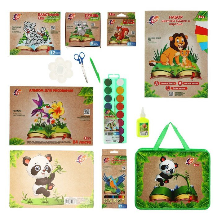 | Состав набора | Папка А4 «ZOO», пластик, ткань, с ручками; Альбом для рисования на скрепке «ZOO» А4, 24 листа; Набор цветной бумаги и картона «ZOO» А4, 20 листов; Ножницы школьные 13,5см; Коврик А4 для творчества «ZOO»; Палитра «Цветочек»; Краски гуашевые «ZOO» 9 цветов; Кисть «Пони» №3; Краски акварельные «ZOO» 16 цветов; Мелки восковые «ZOO» 12 цветов; Стек для лепки; Пластилин «ZOO» 12 цветов; Клей ПВА-М 65 г; Карандаши пластиковые «ZOO» 12цветов |