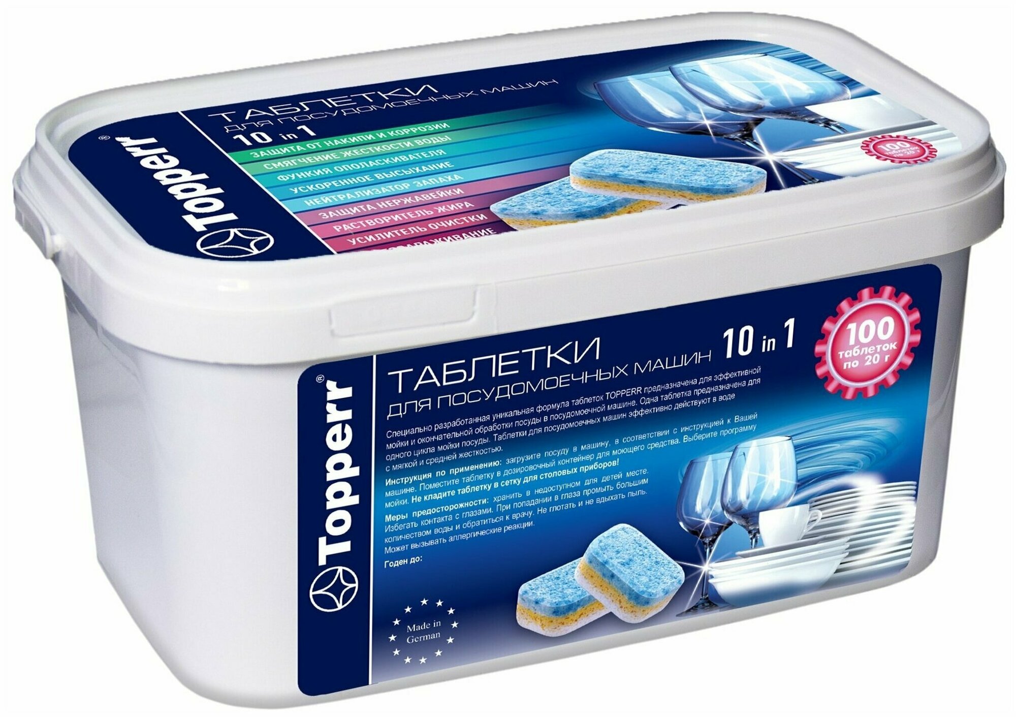 Название TOPPERR 3329 Таблетки для посудомоечных машин 10в1, 100 шт. в уп. Объем 2 л. Количество таблеток-капсул 100 шт. Количество упаковок 1 шт. Вес 1.1 кг. Бренд Topperr. Средство таблетки. Содержит энзимы. Не содержит аммиак, искусственные красители, нефтепродукты, спирт, формальдегид, хлор. Особенности антибактериальное, гипоаллергенное, концентрат, не тестировалось на животных. Назначение для защиты от накипи, для мытья в холодной воде, для мытья посуды, для нержавеющей стали, для придания блеска, для серебра, фарфора и посуды с росписью, для стекла, для устранения запаха. Состав набора таблетки. Состав 50% фосфонаты, 16-19% карбонаты, 12-15% отбеливающий реагент на основе кислорода, 3-6% поликарбоксилаты, 2-5% неионные ПАВ, 1-4% силикаты, 1-3% энзимы (протеаза, амилаза). Способ применения снимите защитную плёнку с таблетки. Поместите таблетку в дозировочный контейнер для моющего средства. Комплектация таблетки для посудомоечной машины, ведро хозяйственное пластиковое. Срок годности 1733 дн.