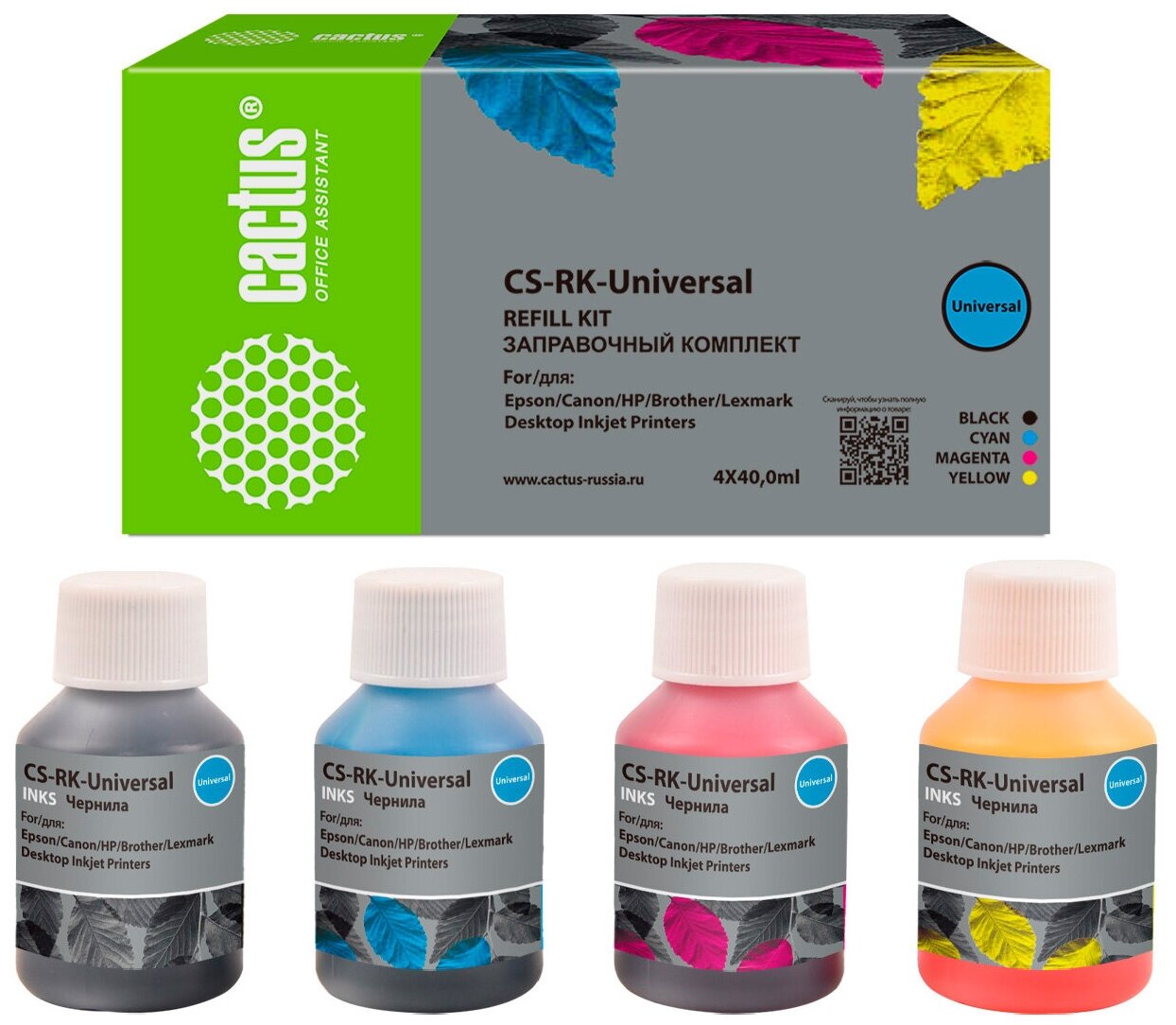 Заправочный набор Cactus CS-RK-Universal голубой/пурпурный/желтый/черный, флаконов: 4, объём 40мл, для HP/Lexmark/Canon