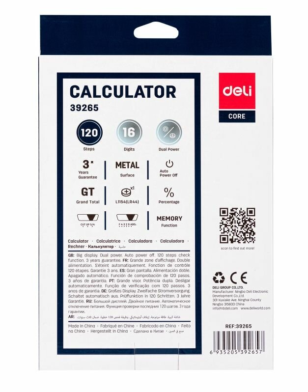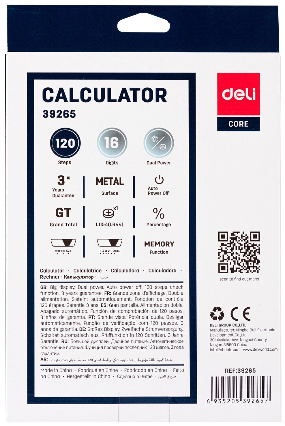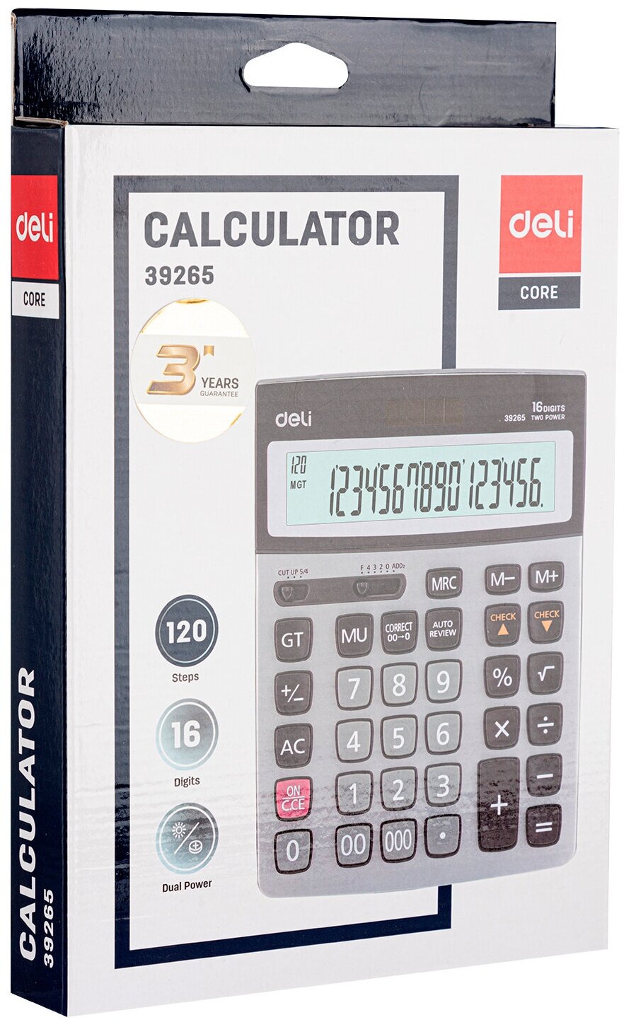 Калькулятор бухгалтерский Deli E39265 серый, дисплей: 16-разрядный, однострочный, монохромный, питание комбинированное LR44 х 1шт.