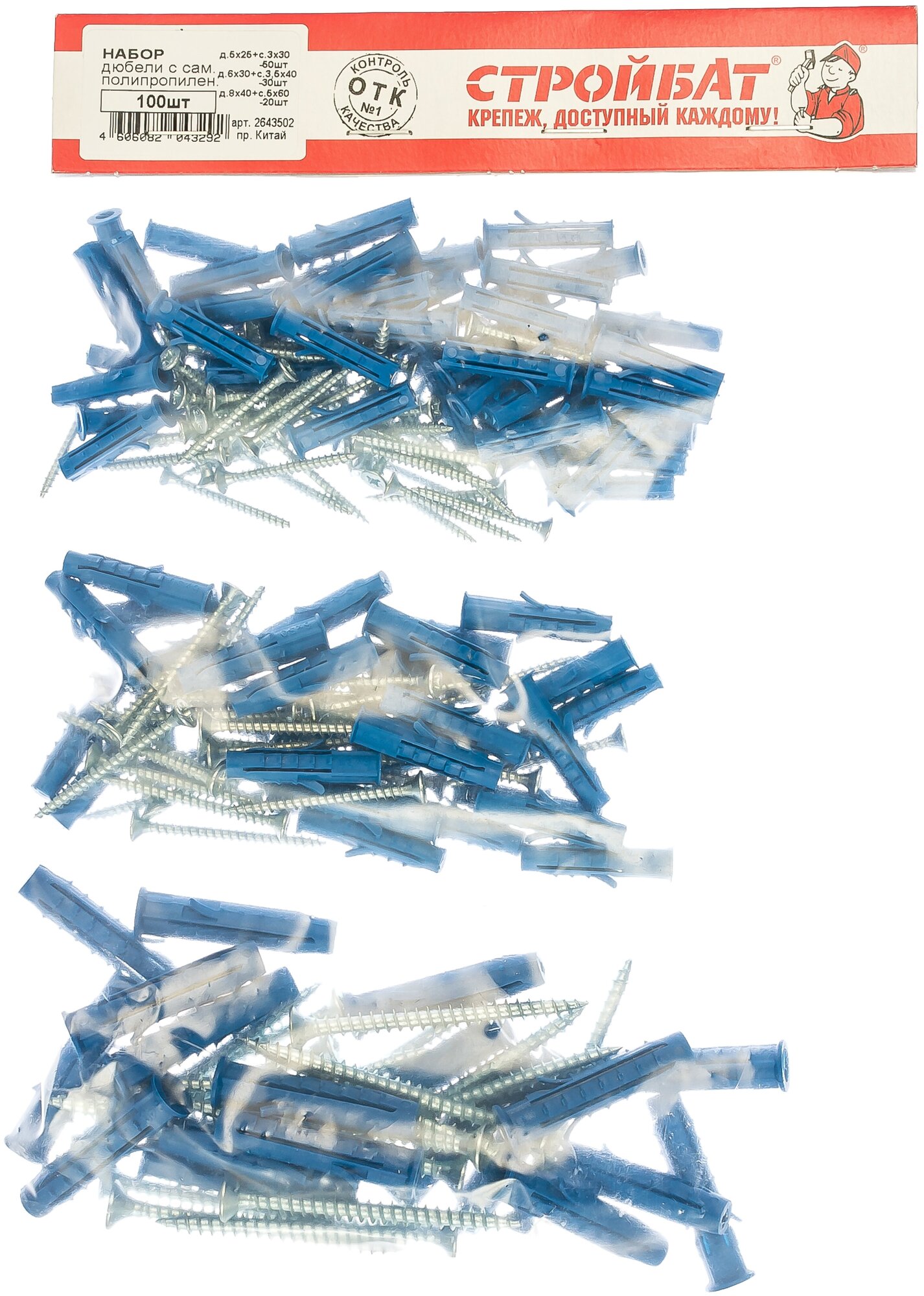 Набор дюбелей с саморезами СТРОЙБАТ полипропилен 100шт (20443)