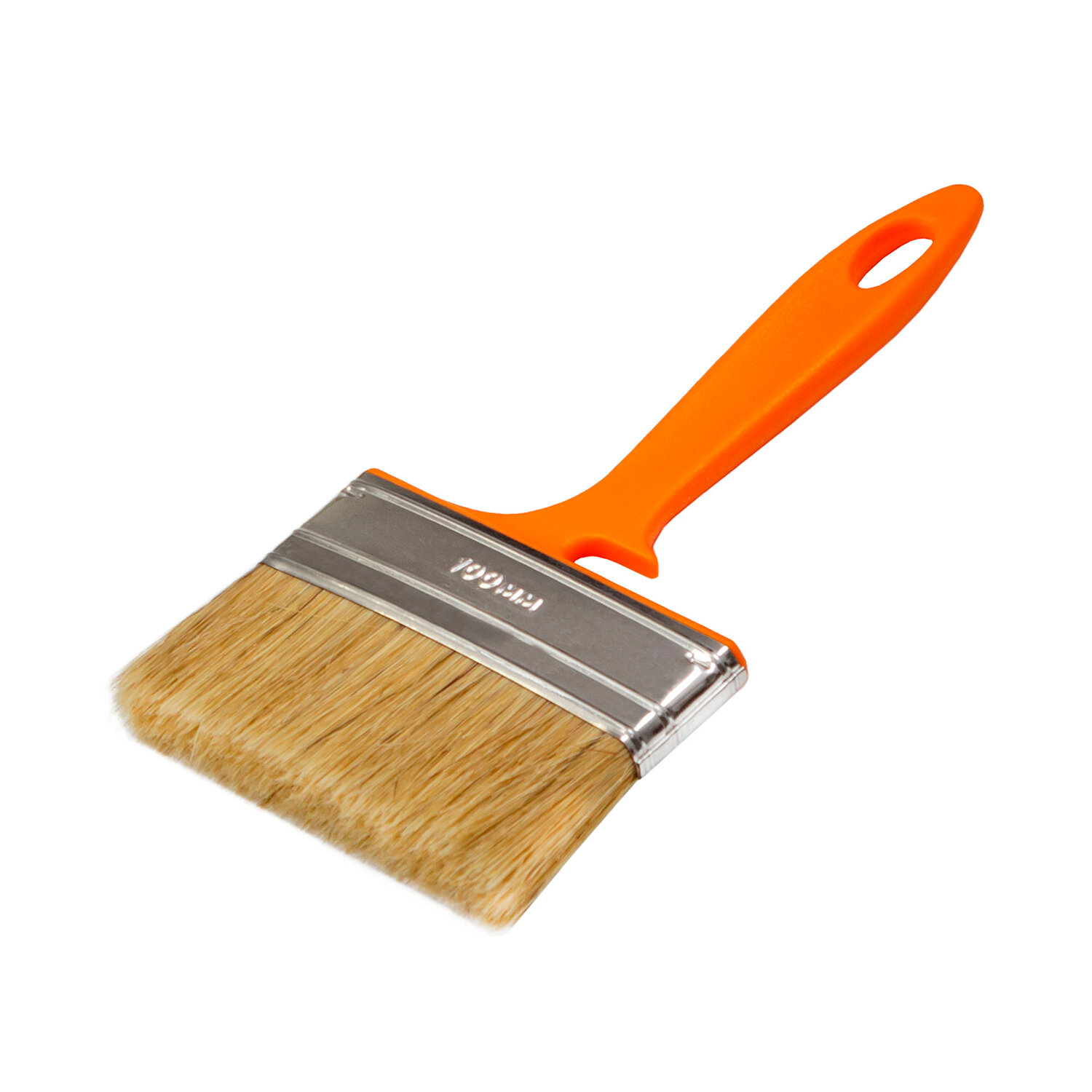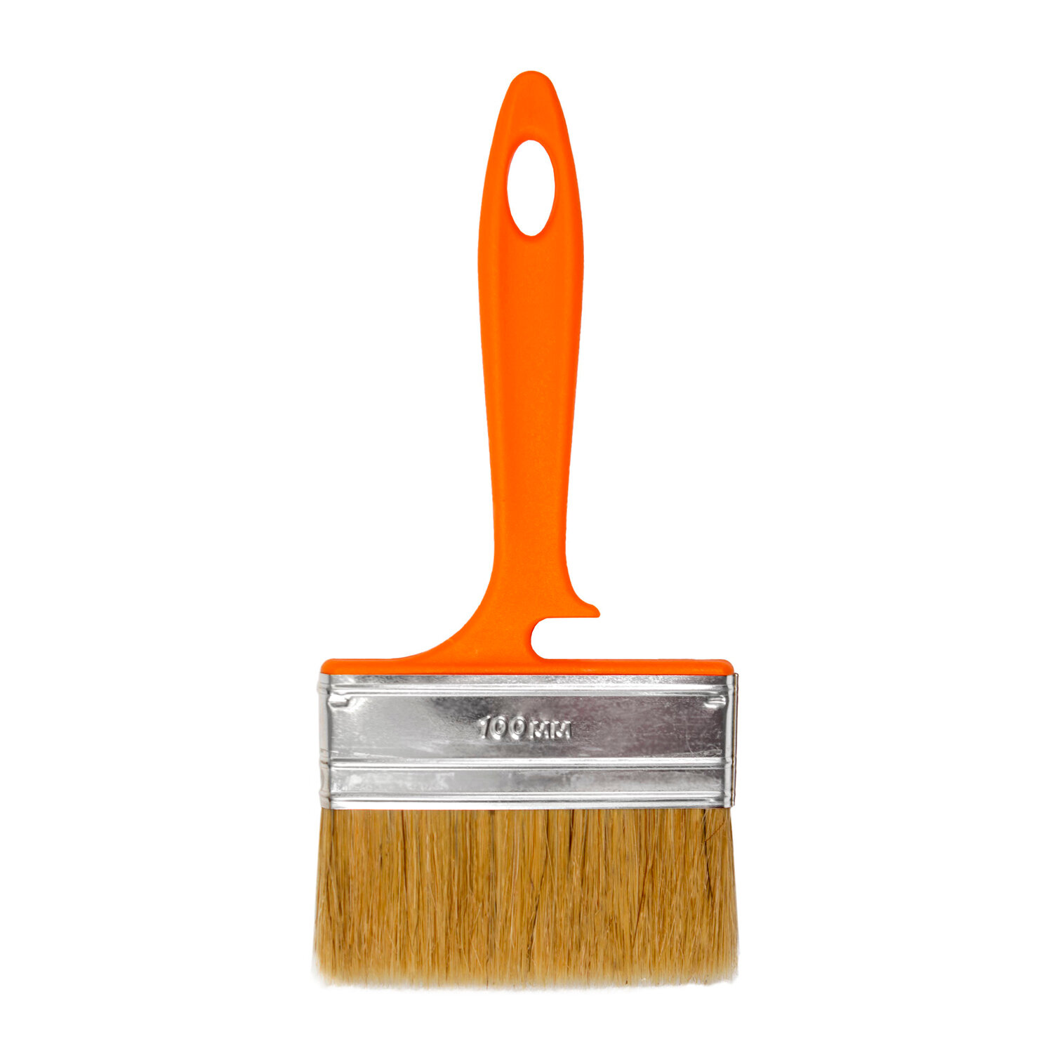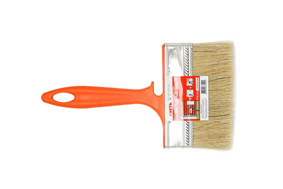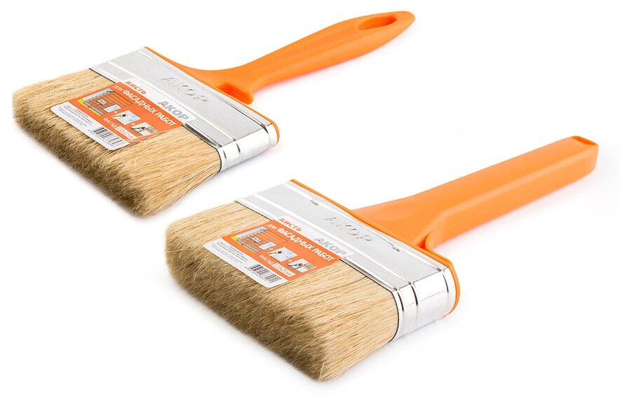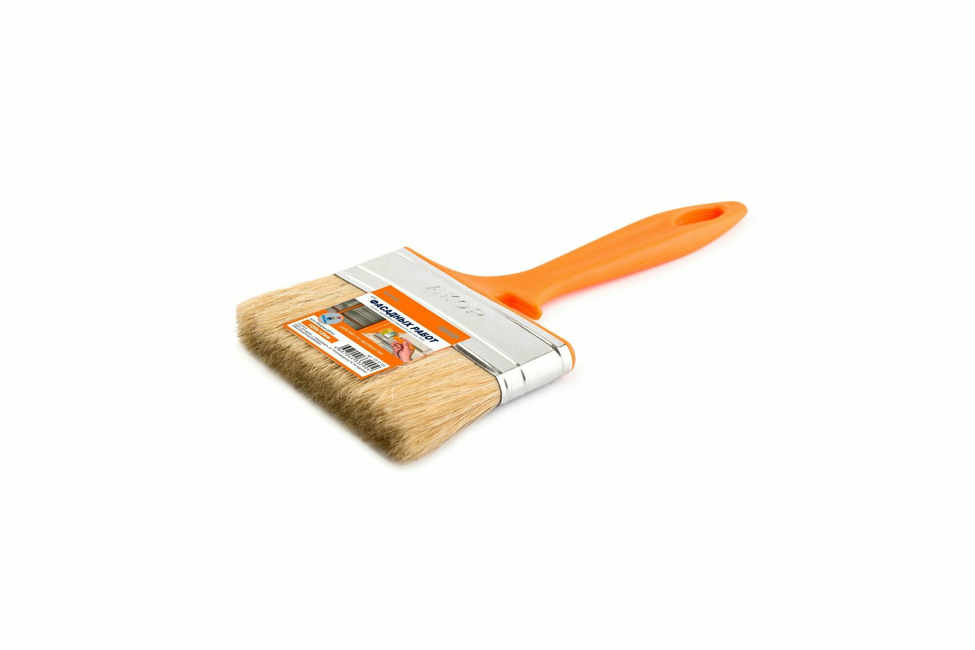 "Фасадные работы" требуют, как правило, более густой, плотной набивки щетины по сравнению с прочими кистями. Данную группу кистей отличает высокая производительность и прочная фиксация щетины. Устойчивы к истиранию. Практикуется использование для работ с "Эмалями" и "Лаками" на больших площадях обрабатываемой поверхности. Светлая натуральная щетина, оранжевая пластиковая ручка с возможностью крепления на емкости с краской.