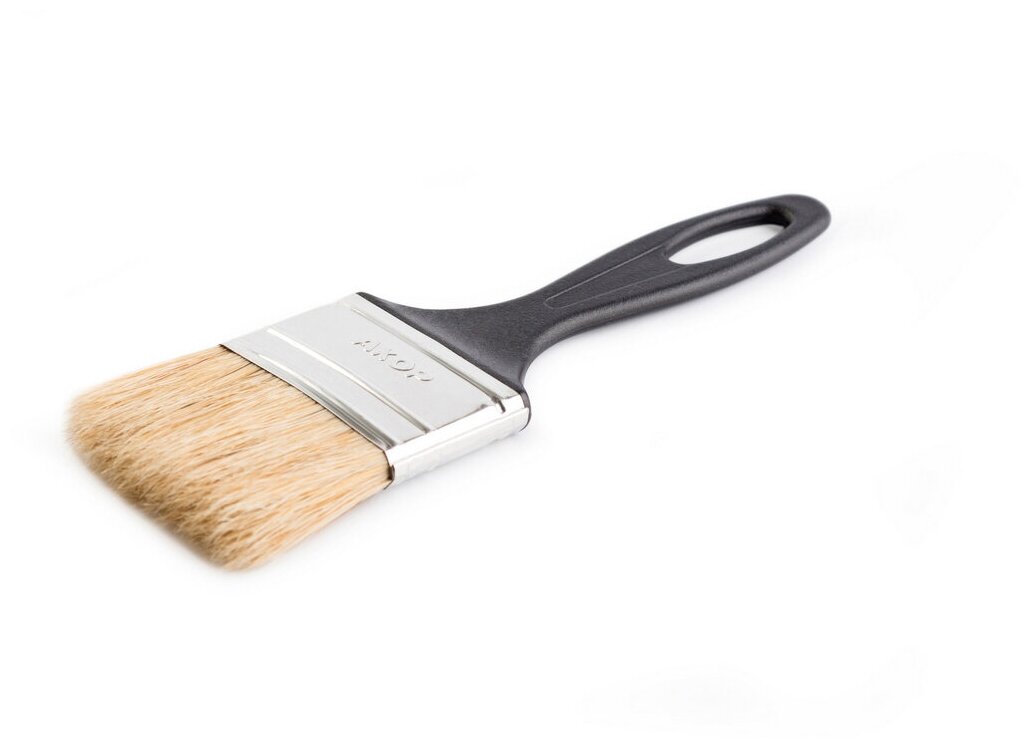 Плоская кисть Акор Евро - ручной малярный инструмент с удобной пластиковой ручкой и со светлой натуральной щетиной. Используют для нанесения лакокрасочных материалов на поверхности стен, потолка и различных конструкций.