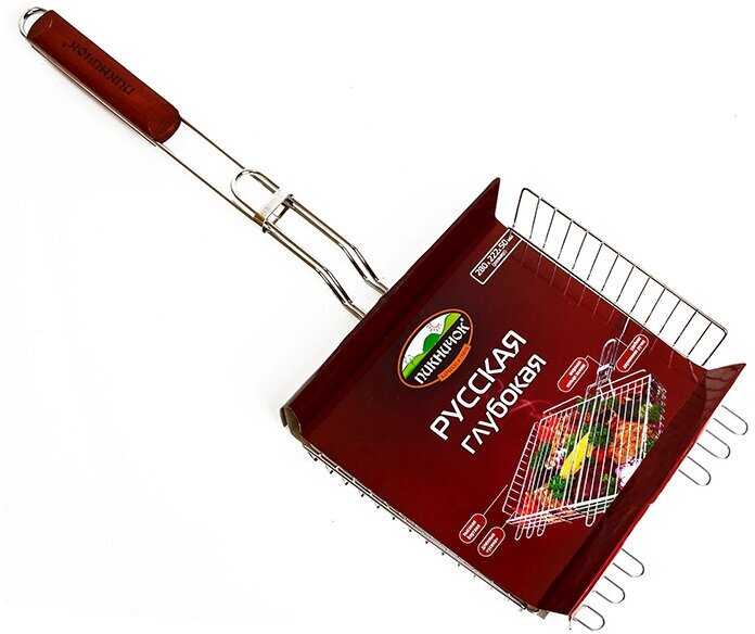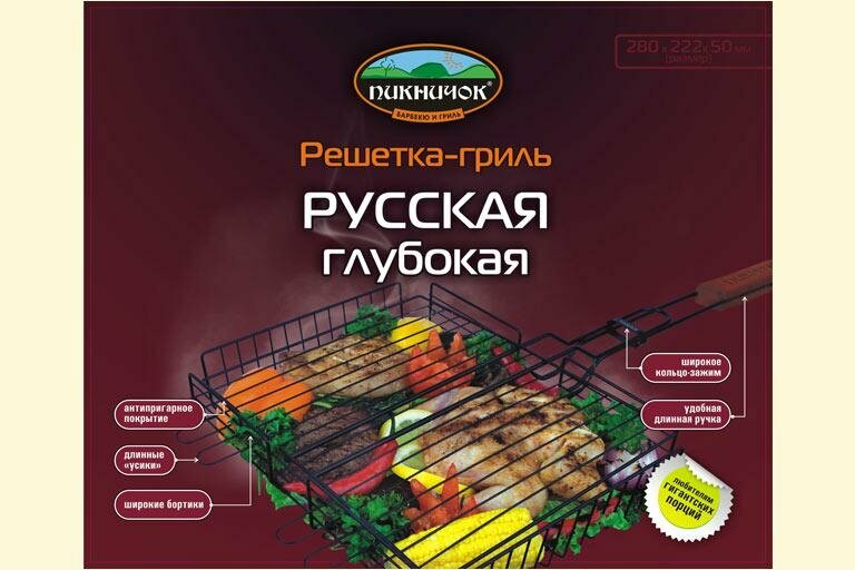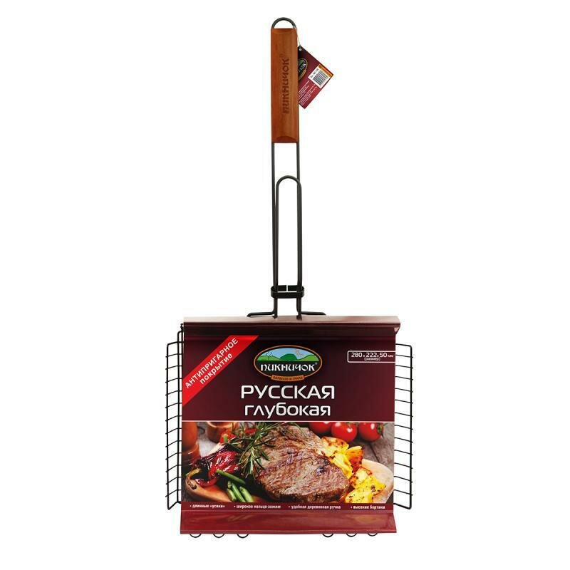 В решетке-гриль "Русская" глубокая удобно готовить мясо, рыбу, птицу, морепродукты и овощи крупными и цельными кусками. Решетка-гриль "Русская" глубокая рассчитана крупные порции и большую компанию. При изготовлении решетки-гриль используется высококачественная сталь с антипригарным покрытием, поэтому при длительном использовании она не теряет своей формы, а так же Вы легко удалите с нее остатки пищи. Вы получите сочные куски, если их толщина не будет превышать 4,5см.Выберите Решетка "ПИКНИЧОК" Русская, глубокая антипригарная 280*222*50 (10) по доступным ценам. Оформите заказ, и мы доставим его, как можно скорее.