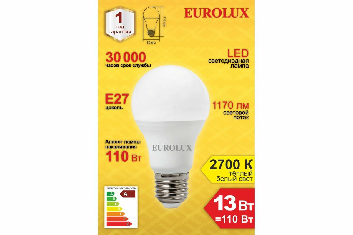 Лампа светодиодная Eurolux Е27 A60 13W 2700К LL-E-A60-13W-230-27K груша (76/2/17)