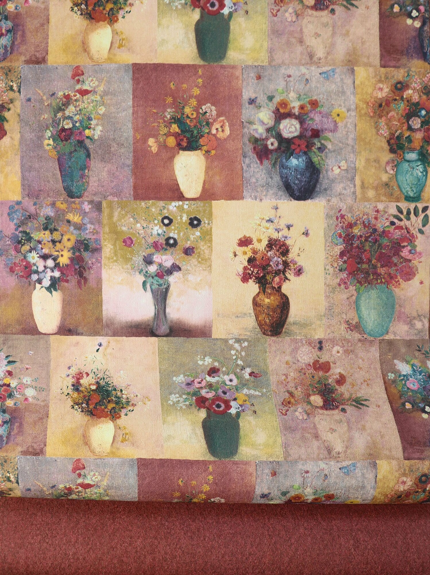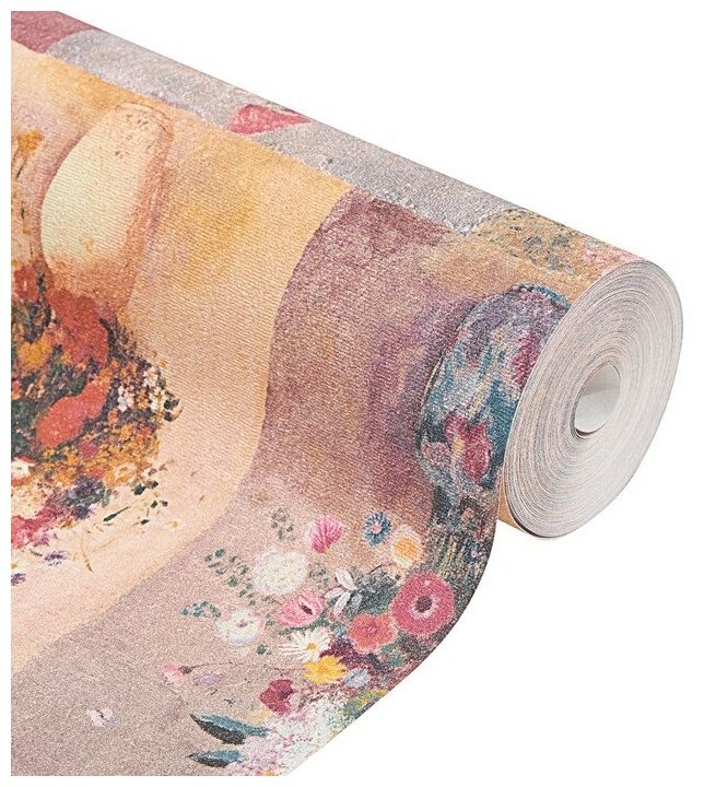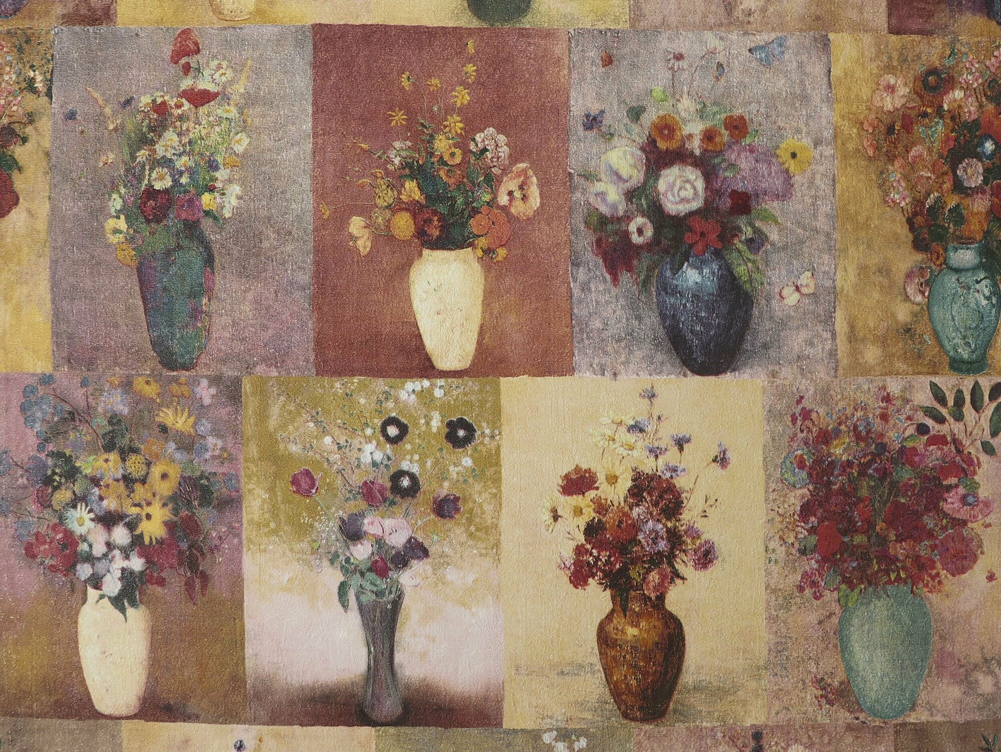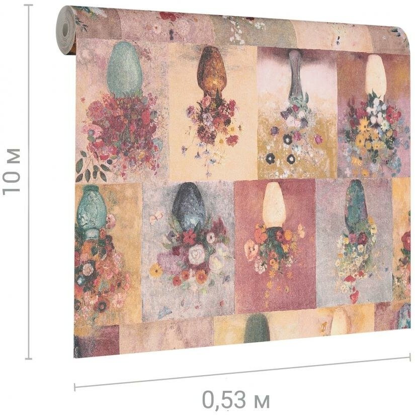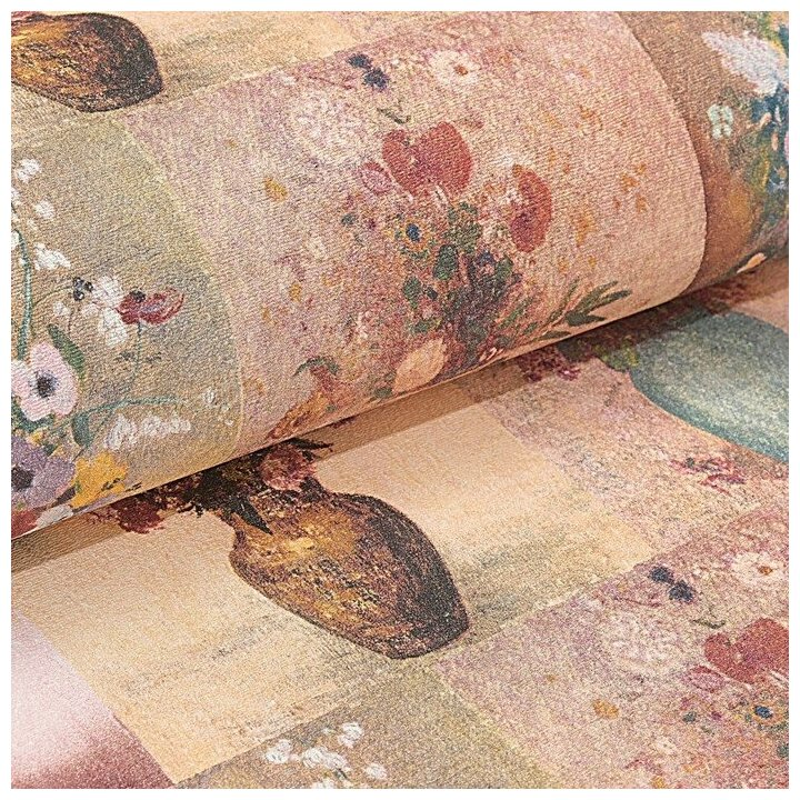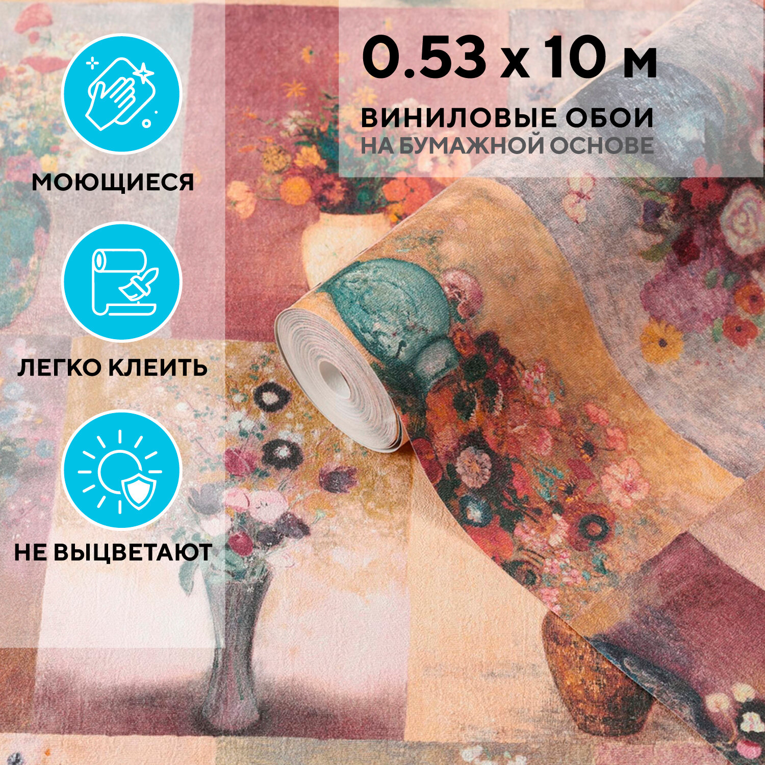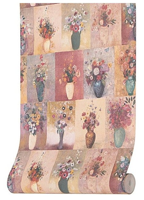 Обои виниловые горячего тиснения на бумажной основе. Размер рулона 0,53х10м. Технические характеристики: хорошая светоустойчивость, высокая устойчивость к мытью. Уйтный дизайн, составленный из разнообразных фрагментов с изображениями цветов в вазах.