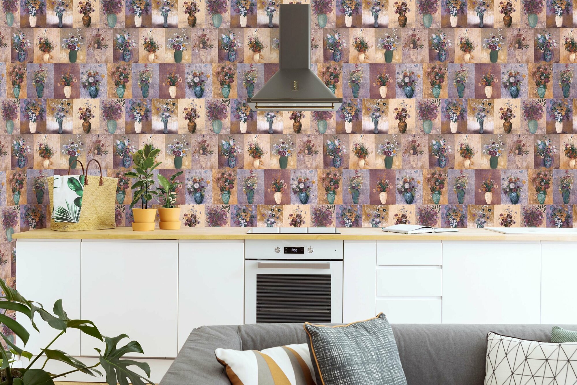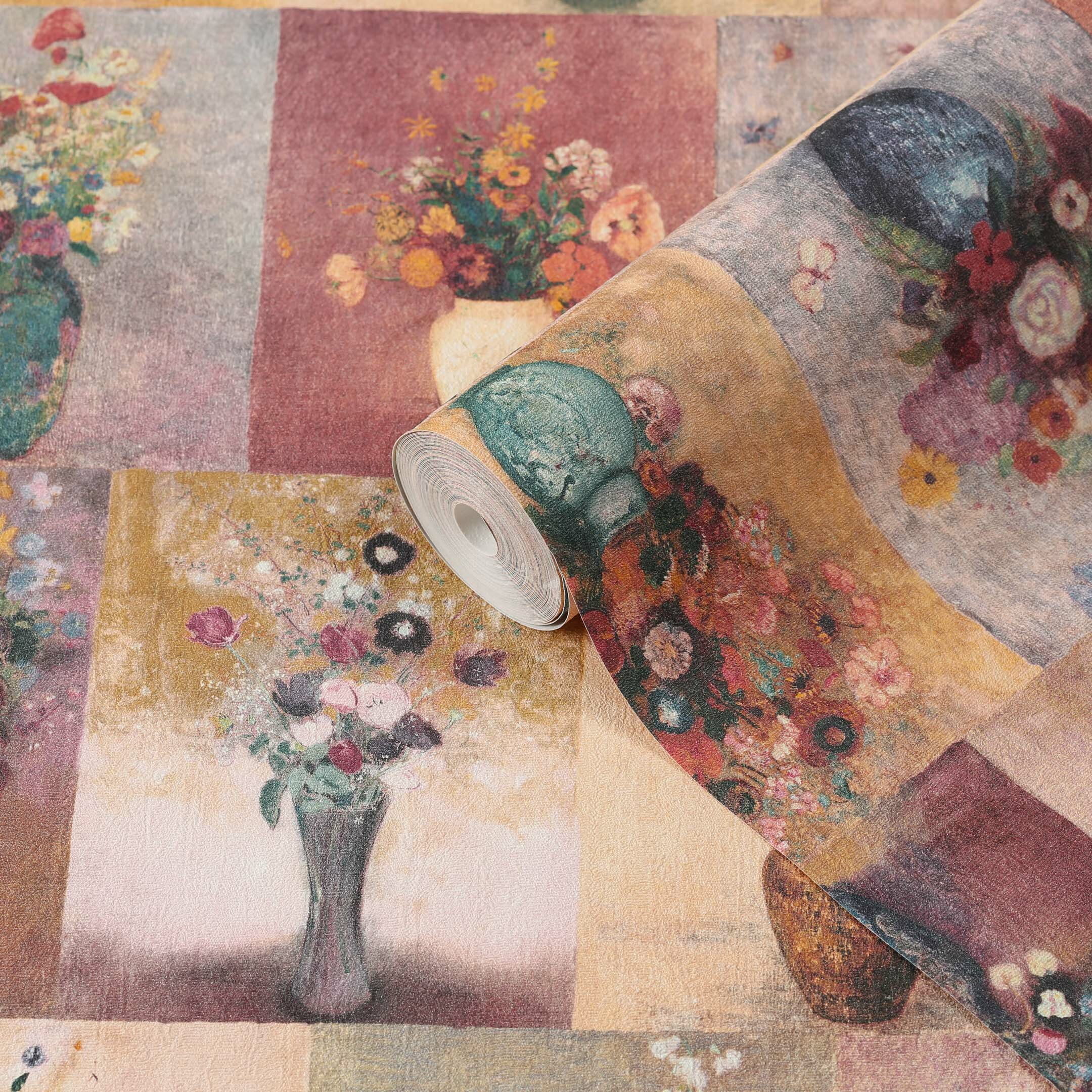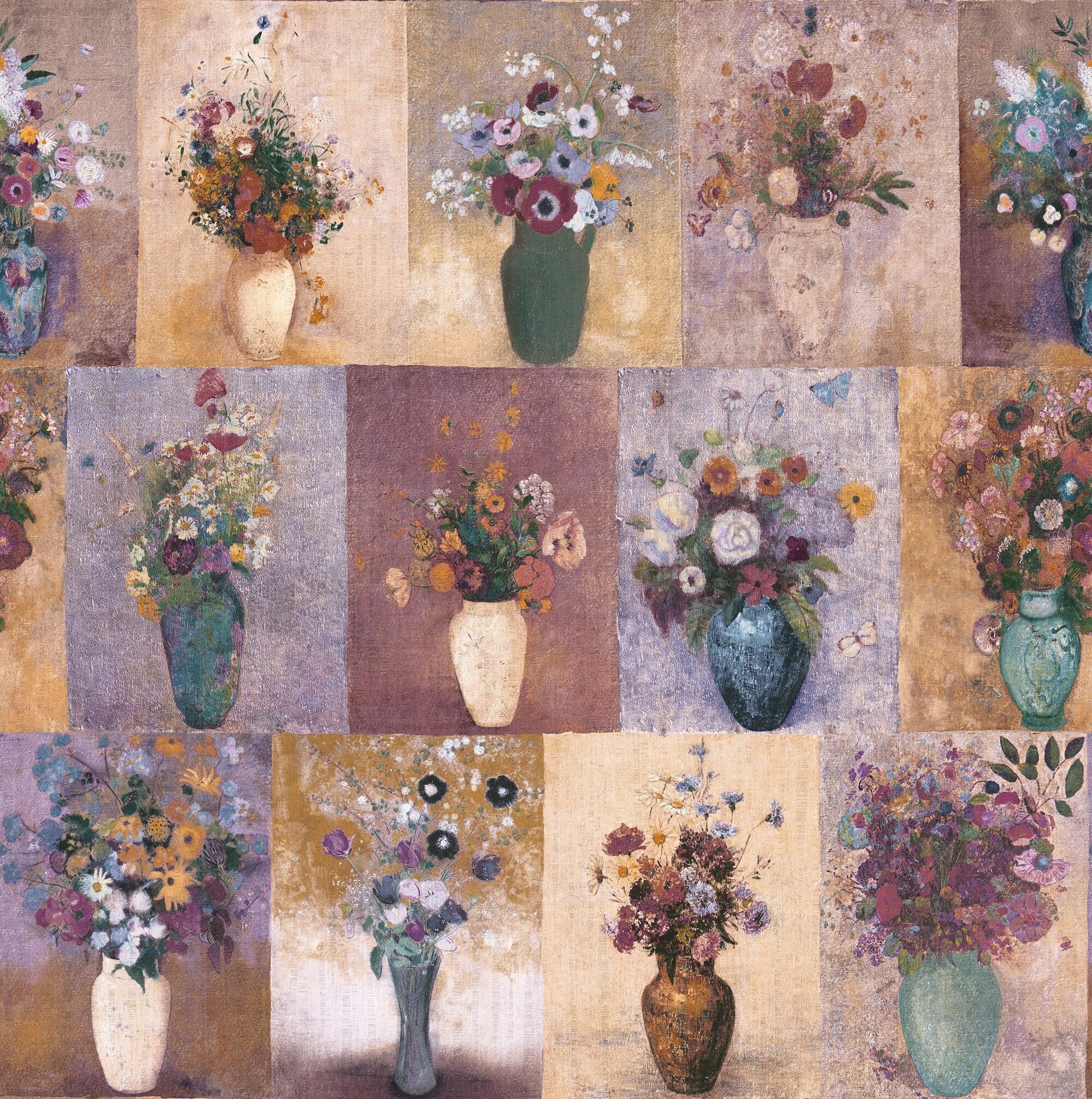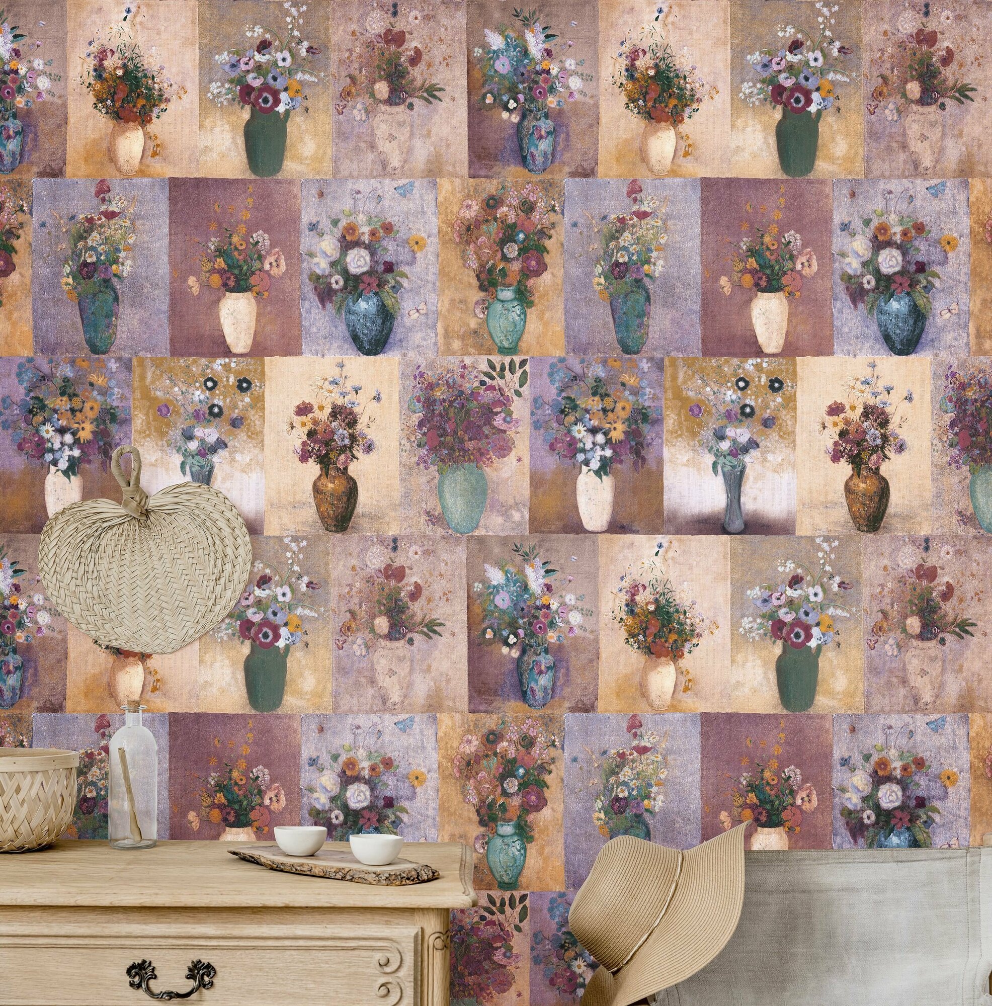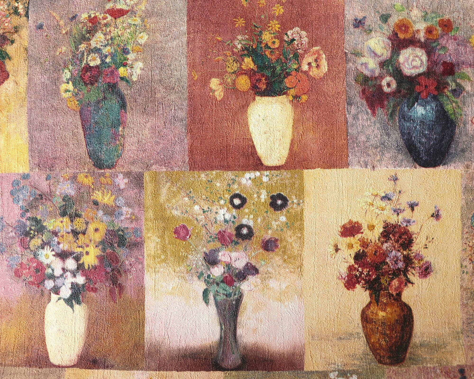 Обои виниловые горячего тиснения на бумажной основе. Размер рулона 0,53х10м. Технические характеристики: хорошая светоустойчивость, высокая устойчивость к мытью. Уйтный дизайн, составленный из разнообразных фрагментов с изображениями цветов в вазах.