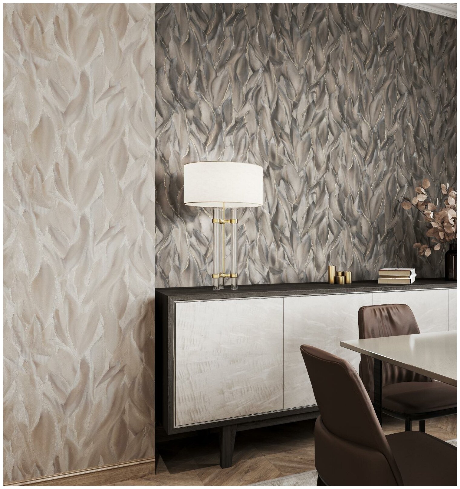Это уникальная черта коллекции, когда мотив и компаньон отличаются лишь одним элементом – искрящимися вкраплениями декора. Сочетание фона и рисунка в одном помещении позволит создать бесшовное полотно узора и добавить интерьеру сверкающую интригу.При этом природные оттенки обоев подчеркнут изысканный вкус дома и наполнят его цветами розового кварца, травянистого изумруда, каштанового оникса или лилейного опала. Колористики коллекции многогранны и при размещении друг с другом рождают множество гармоничных сочетаний.