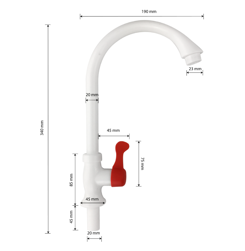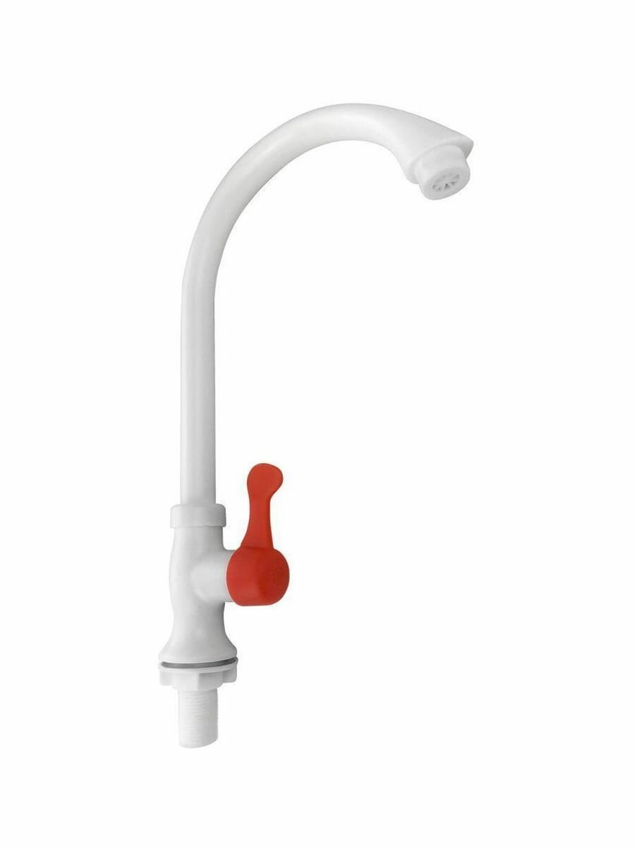 Кран на одну воду, из высокопрочного пластика АБС, БЕЛЫЙ, с аэратором для экономии воды. Крепление резьба - гайка. Кранбукса м/к, красная ручка - флажок, поворот на 90?. Габаритные размеры: высота 295 мм, длина 190 мм, диаметр посадочного седла 45 мм, длина резьбы 45 мм. Вес - 0,220 кг. В комплекте корпус, прокладка.