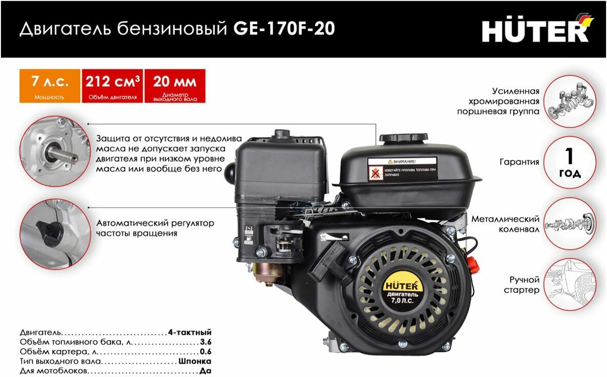Двигатель бензиновый HUTER GE-170F-20 предназначен для установки на садовую технику и другую технику, для которых подходят двигатели "Под шпонку", к примеру мотоблоки, снегоуборщики, мотопомпы и т.д. Мощность 7 л.с. Достаточна для работы с большинством видов техники. Датчик уровня масла защищает двигатель от работы без масла.