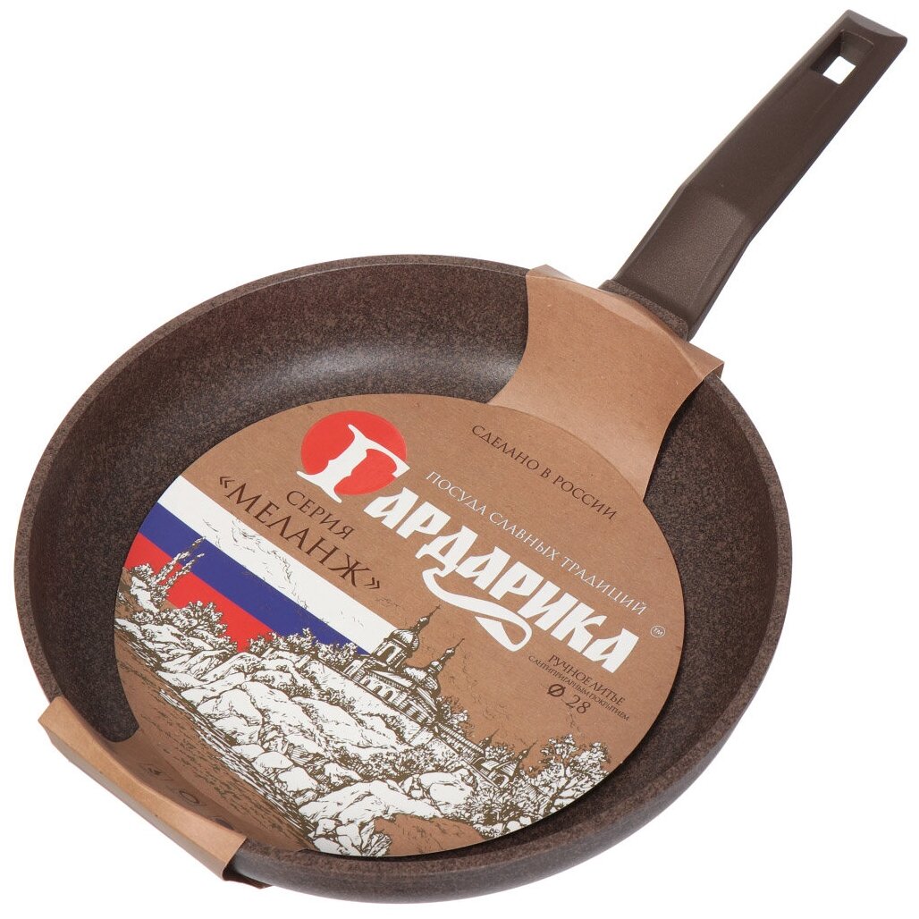 Сковорода для жарки Гардарика Меланж с антипригарным покрытием Greblon C2+ немецкого качества. Подходит ко всем плитам, кроме индукционных. Можно использовать в посудомоечной машине.