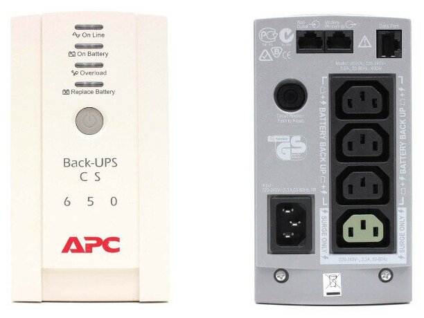 Источник бесперебойного питания (ИБП) APC Back-UPS CS 650VA имеет четыре компьютерных розетки, одна из которых — без резервного питания. Оснащен многоразовым автоматическим предохранителем. Защищает на высоком уровне домашние и офисные компьютеры, имеющие большую мощность энергопотребления. Информирует о всплесках и отключении напряжения световыми и звуковыми сигналами. Не нуждается в сложном техническом обслуживании — пользователь может заменить батарею самостоятельно.