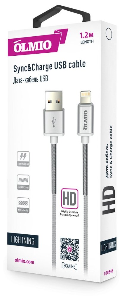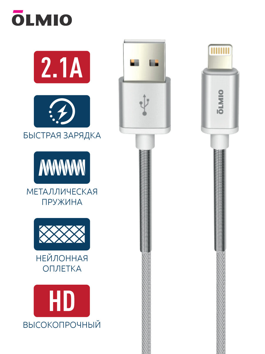 Кабель HD, USB 2.0 - lightning, 1.2м, 2.1A, белый, Olmio 038645 г/к/рн