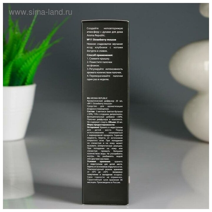 | Комплектация | Флакон с ароматической жидкостью 20 мл - 1 шт., палочки для распространения аромата - 6 шт. |