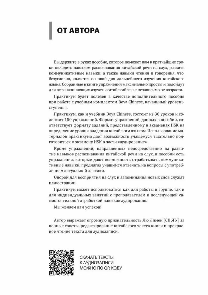 Пособие состоит из 30 уроков и содержит 150 упражнений, которые максимально просты и подойдут для всех начинающих изучать китайский язык. Все упражнения дополнены аудиоматериалами, которые доступны по QR-кодам, данным в начале каждого урока. Формат упражнений практикума соответствует формату заданий, представленному в экзаменах HSK на определение уровня владения китайским языком. Использование пособия поможет учащемуся тщательно подготовиться к экзамену HSK в части "аудирование".