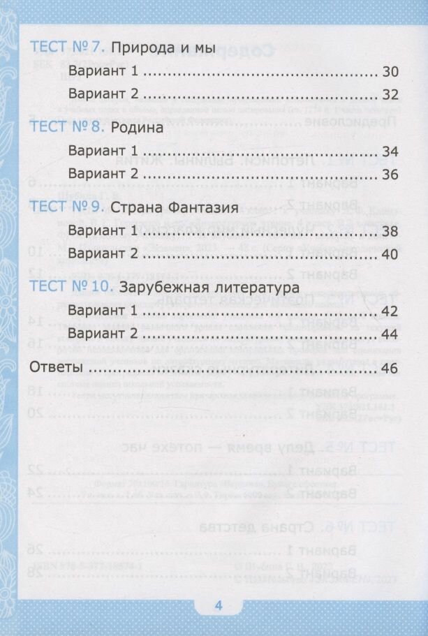 Данное пособие полностью соответствует федеральному государственному образовательному стандарту (второго поколения) для начальной школы. Предлагаемое пособие адресовано учащимся 4-х классов начальной школы. Тестовые задания различного уровня сложности ориентированы на текущий контроль и оценку знаний учащихся по литературному чтению. Тесты могут выборочно использоваться для организации контрольных проверок при оценивании достижений учеников по литературному чтению. Материалы разработаны в соответствии с программой по литературному чтению и могут быть использованы как система оценки школьной успеваемости. Тесты могут использоваться при прохождении материала по любой программе.