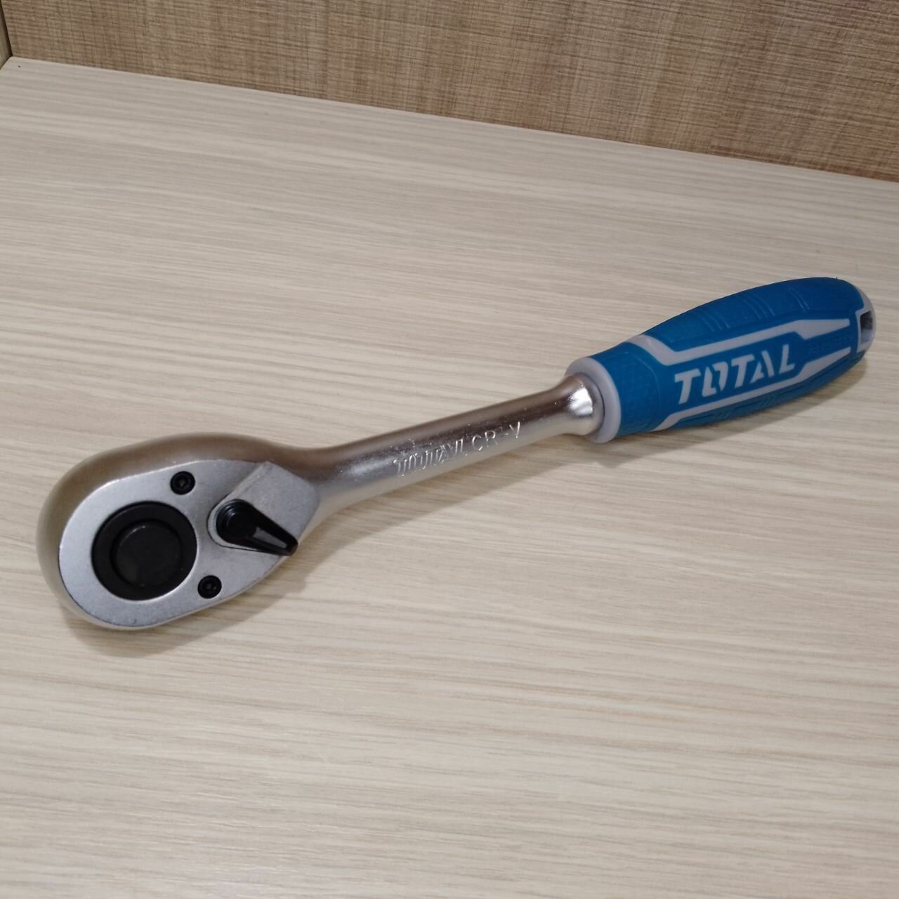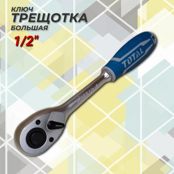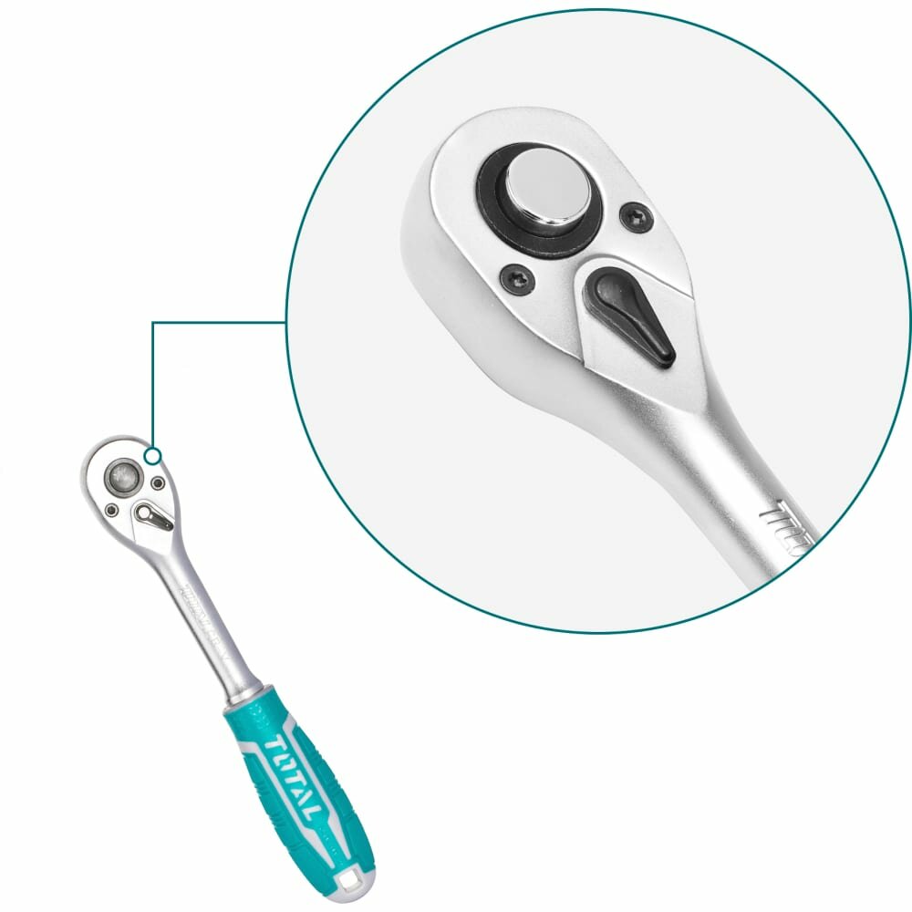 Ключ-трещотка 1/2" TOTAL — надежный ручной инструмент для работ с торцевыми головками. Посадочный квадрат - 1/2", количество зубьев - 45.