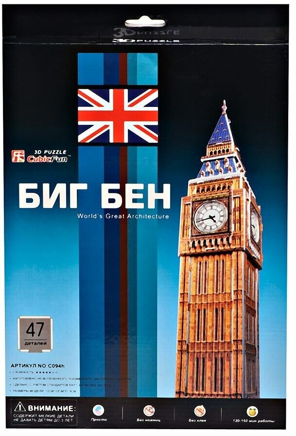 3D пазл "Биг Бен" 47 деталей марки CubicFun. Необычный набор 3D-пазлов точно воссоздает объемную масштабированную модель своего прототипа. Для сборки модели не нужен клей, детали отлично совмещаются друг с другом, а выполнены они из полимерных материалов высокого качества и бумаги. Достаточно просто соединить элементы конструктора, и вы получите объемную модель здания Биг Бена.