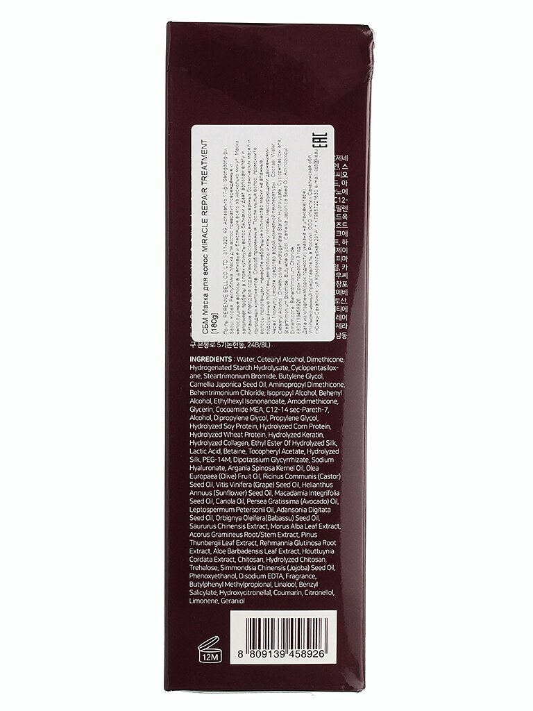 | Состав | Water, Cetearyl Alcohol, Dimethicone, Hydrogenated Starch Hydrolysate, Cyclopentasiloxane, Steartrimonium Bromide, Butylene Glycol, Camellia Japonica Seed Oil, Aminopropyl Dimethicone, Behentrimonium Chloride, Isopropyl Alcohol, Behenyl Alcohol, Ethylhexyl Isononanoate, Amodimethicone, Glycerin, Cocoamide Mea, C12-14 Sec-pareth-7, Alcohol, Dipropylene Glycol, Propylene Glycol, Hydrolyzed Soy Protein, Hydrolyzed Corn Protein, Hydrolyzed Wheat Protein, Hydrolyzed Keratin, Hydrolyzed Collagen, Ethyl Ester Of Hydrolyzed Silk, Lactic Acid, Betaine, Tocopheryl Acetate, Hydrolyzed Silk, Peg-14m, Dipotassium Glycyrrhizate, Sodium Hyaluronate, Argania Spinosa Kernel Oil, Olea Europaea (olive) Fruit Oil, Ricinus Communis (castor) Seed Oil, Vitis Vinifera (grape) Seed Oil, Helianthus Annuus (sunflower) Seed Oil, Macadamia Integrifolia Seed Oil, Canola Oil, Persea Gratissima (avocado) Oil, Leptospermum Petersonii Oil, Adansonia Digitata Seed Oil, Orbignya Oleifera (babassu) Seed Oil, Saururus Chinensis Extract, Morus Alba Leaf Extract, Acorus Gramineus Root/stem Extract, Pinus Thunbergii Leaf Extract, Rehmannia Glutinosa Root Extract, Aloe Barbadensis Leaf Extract, Houttuynia Cordata Extract, Chitosan, Hydrolyzed Chitosan, Trehalose, Simmondsia Chinensis (jojoba) Seed Oil, Phenoxyethanol, Disodium Edta, Fragrance |