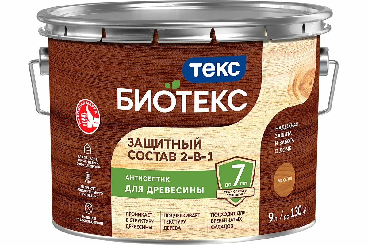 Антисептик ТЕКС БИОТЕКС, состав 2 в 1 КЛАССИК, декоративное лессирующее средство для защиты древесины от атмосферных воздействий, биологических повреждений, а также для декоративной отделки стен, дверей, оконных рам, террас (в т.ч. полов) и других новых или ранее обработанных защитными средствами деревянных строительных конструкций снаружи помещений. Не образует сплошной пленки после нанесения первого слоя, глубоко проникает в структуру древесины. Позволяет продлить срок службы древесины, сохранить ее структуру и придать декоративный эффект.Расход: 10-14м2/л по строганой и бревенчатой поверхности древесины, 4-6м2/л по пилёной поверхности древесины. Время высыхания на отлип – 1 час, следующий слой можно наносить через – 12 часов, полное – не более 24 часов.Выберите Состав 2-в-1 BIOTEKS Классик махагон (9л) по доступным ценам. Оформите заказ, и мы доставим его, как можно скорее.