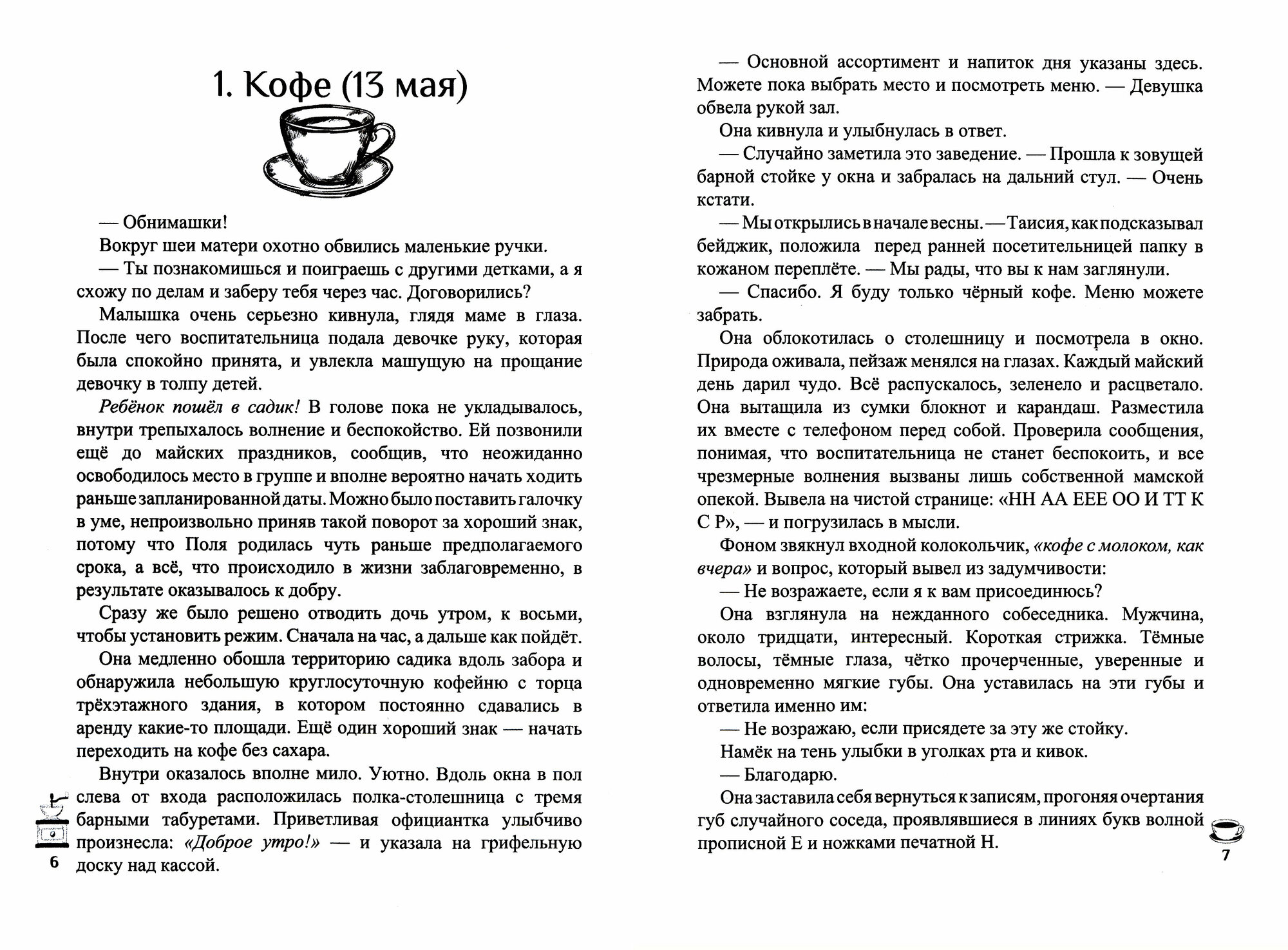 Анастасия и Павел… Для них встреча в кофейне, и первая чашка кофе стали началом чего то нового, и интересного. Чувства, когда видишь человека и не хочешь чтобы этот день, мгновение заканчивалось. Каждая глава, это новая чашка, встреча, которая сулит героям, что то неизведанное. Мне было приятно, узнавать, что то новое о них, быть очевидцем событий. Читая, я не раз ловила себя на мысли, что вспоминаю героев в течение дня. В диалогах Насти и Паши, можно встретить четверостишия. Они рассуждают о жизни, о прошлом.
