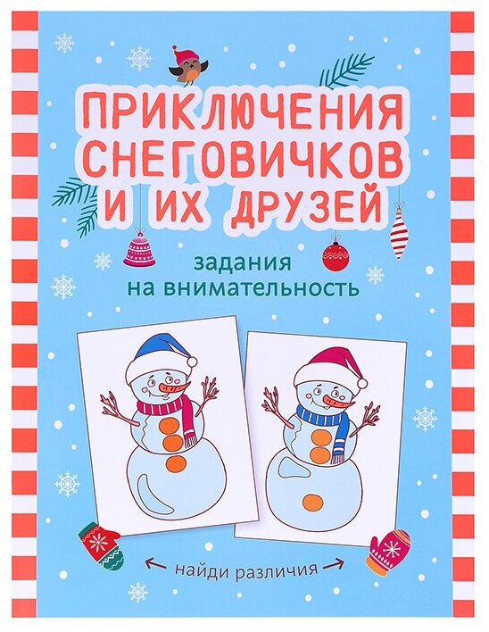 Весёлые снеговички и их друзья готовятся к Новому году. Столько всего надо успеть: позвать гостей, приготовить вкусные кушанья, принести ёлку из леса и нарядить её, упаковать подарки, а ещё покататься с ледовой горки на санках и ватрушках. Недобрая колдунья хочет помешать празднику и всё время пытается запутать снеговичков. Чтобы помочь им, внимательно смотри на рисунки, ищи спрятанные предметы, лишние картинки и находи различия между изображениями. Где-то будет 5 различий, где-то 7, а где-то целых 10! Справишься?