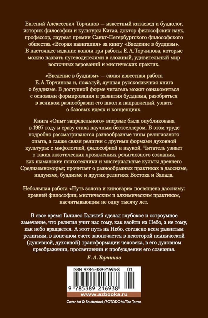 Евгений Алексеевич Торчинов - известный китаевед и буддолог, историк философии и культуры Китая, доктор философских наук, профессор, лауреат премии Санкт-Петербургского философского общества "Вторая навигация" за книгу "Введение в буддизм". В настоящее издание вошли три работы Е. А. Торчинова, которые можно назвать путеводителями в сложный, удивительный мир восточных верований и мистических практик.