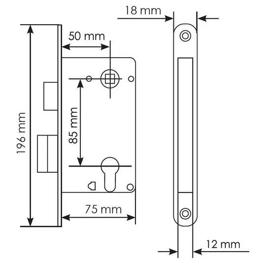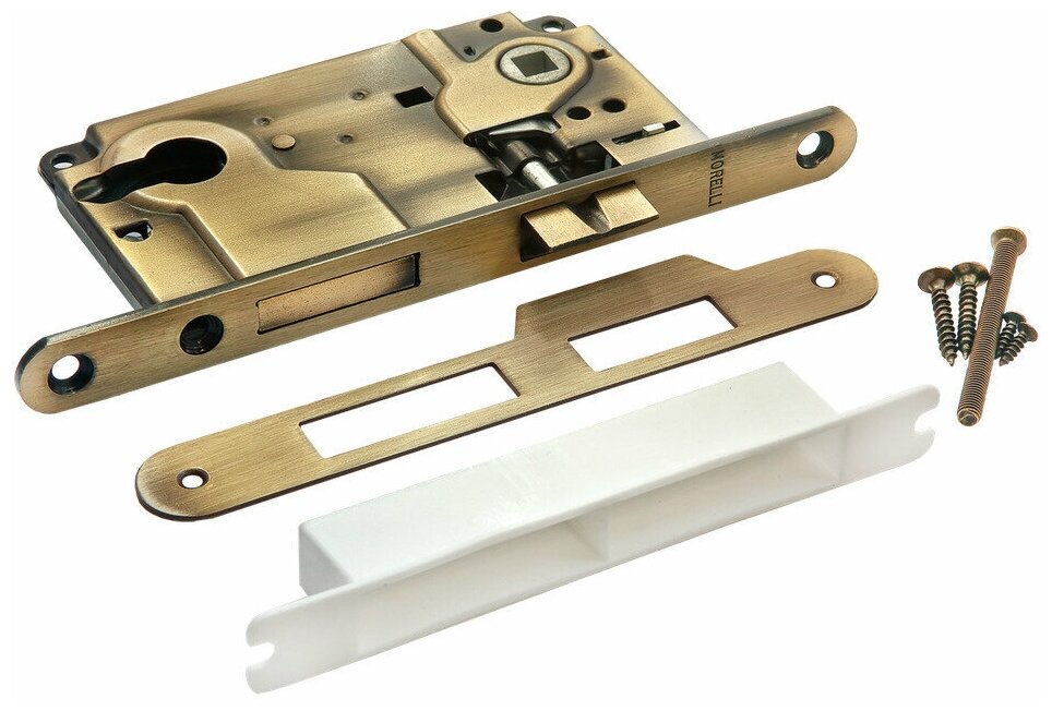 Замок с ригелем под ключевой цилиндр для межкомнатной двери комплектуется с ключевым цилиндром, соответствующим ширине полотна. Подходит для установки, например, на дверь кабинета. Для надежности запирания помимо обычного язычка, используется дополнительный ригель.