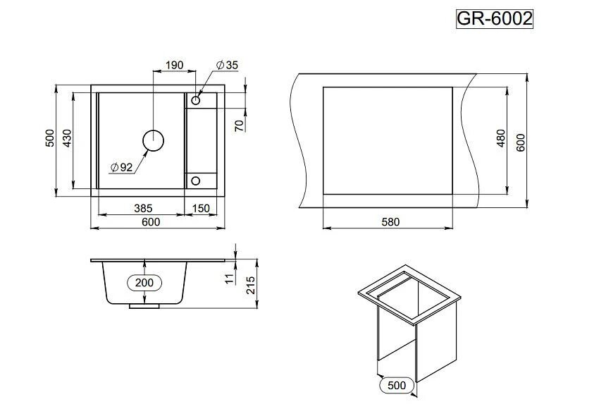 мойка GRANULA 600х500х20мм черный кварц (6002 черный)