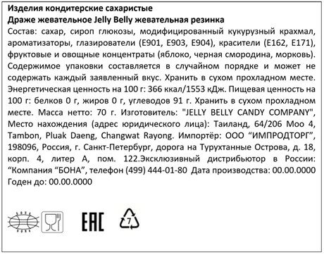 | Состав | Сахар, сироп глюкозы, модифицированный кукурузный крахмал, ароматизаторы, глазирователи (E901, E903, E904), красители (E162, E171), фруктовые и овощные концентраты (яблоко, черная смородина, морковь). |
