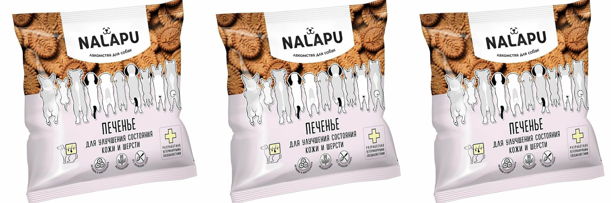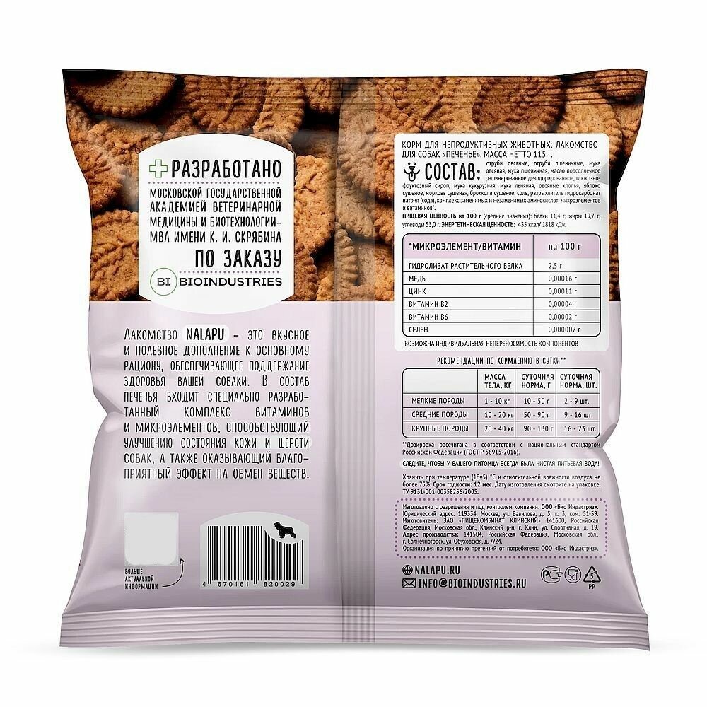 Лакомство для собак Nalapu - вкусное и полезное дополнение к основному рациону, обеспечивающее поддержание здоровья вашей собаки.В состав печенья входит специально разработанный комплекс витаминов и микроэлементов, способствующий улучшению состояния кожи и шерсти собак, а также оказывающий благоприятный эффект на обмен веществ.