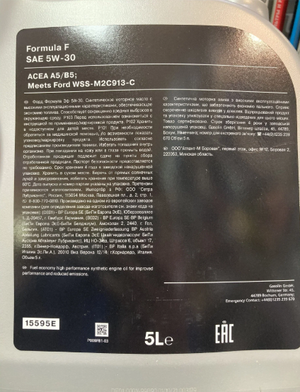 - Оригинальное моторное масло Ford Motorcraft 5W-30 A5 WSS-M2C913-D (15CF54 - замена Formula F 155D3A)