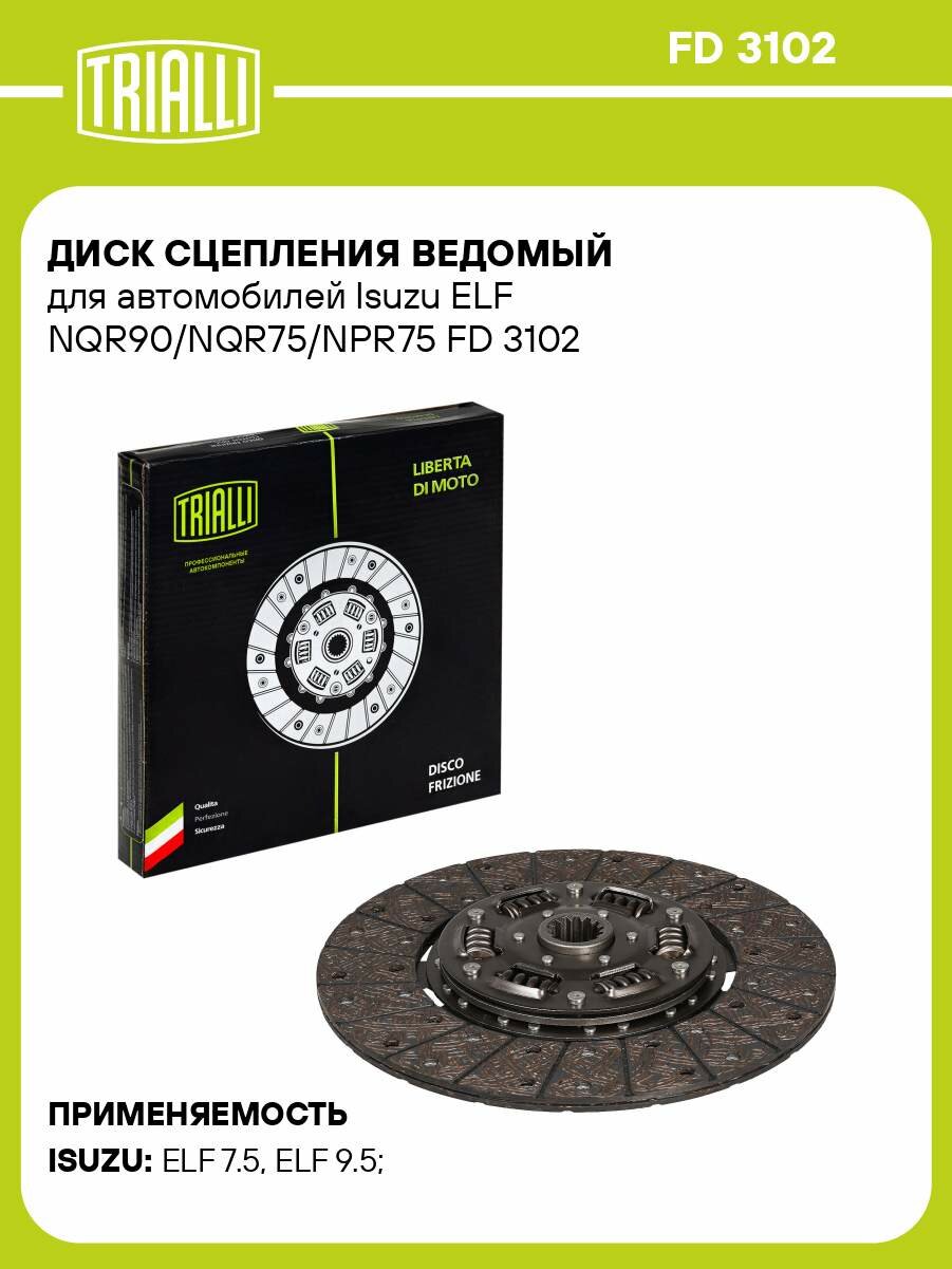 Ведомый диск сцепления TRIALLI FD 3102 для ISUZU ELF NQR90/NQR75/NPR75 является важной частью системы сцепления, обеспечивая плавное и надёжное соединение двигателя с трансмиссией. Его задача – эффективная передача вращательного момента и обеспечение комфортного переключения передач при любых условиях эксплуатации.