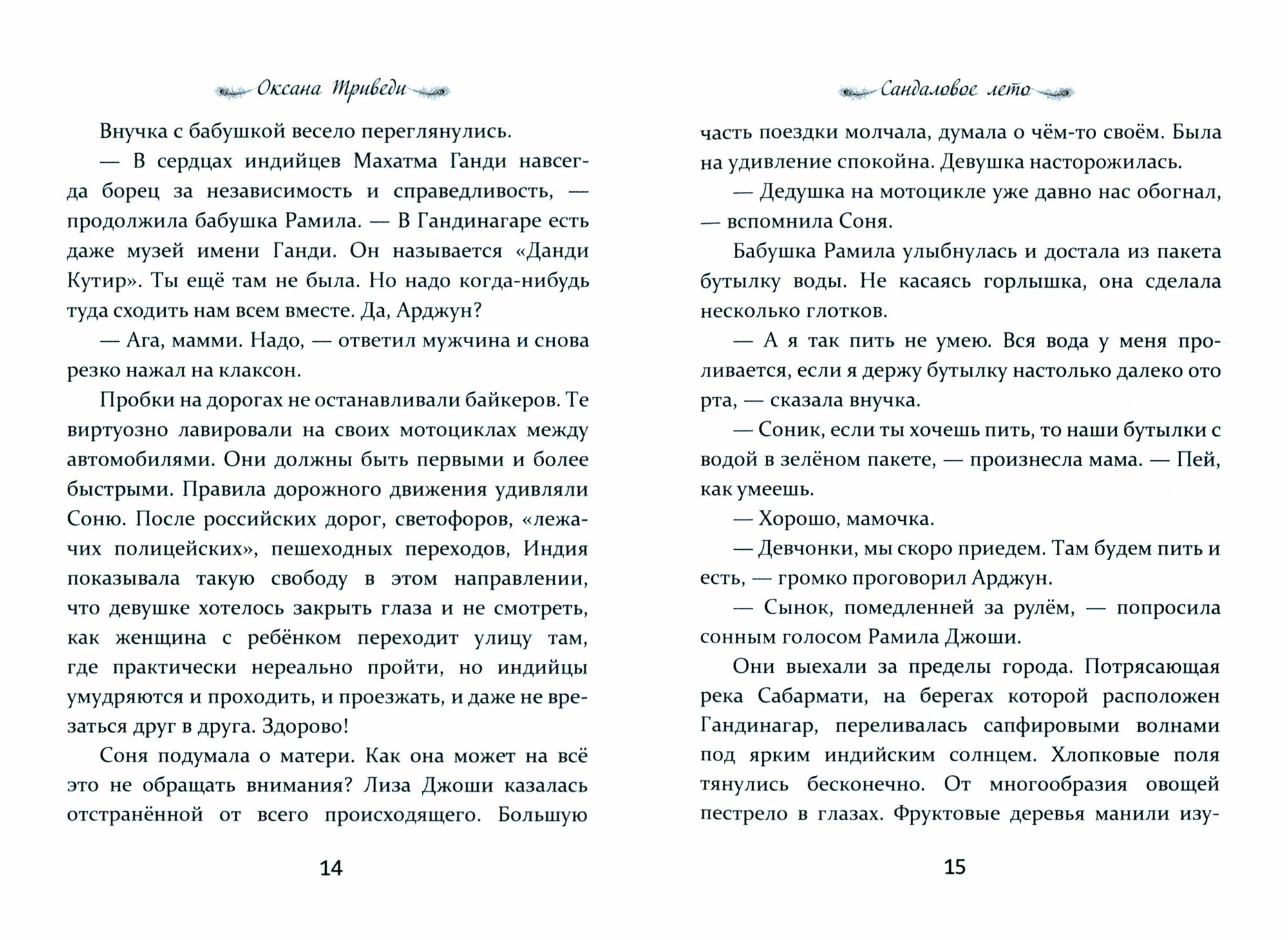 «Сандаловое лето» Оксаны Триведи – история первой любви, где есть место как той минуте, «в которой мир исчез. Просто чарующая обстановка и двое подростков. Безрассудное притяжение. И скороспелое благоразумие», так и осознанию главной героини хрупкости человеческой жизни, ведь она «в один и тот же день увидела, как один человек ушел с этой планеты, а немного позже услышала, что другой человек заявил о своем скором появлении в этом мире». -