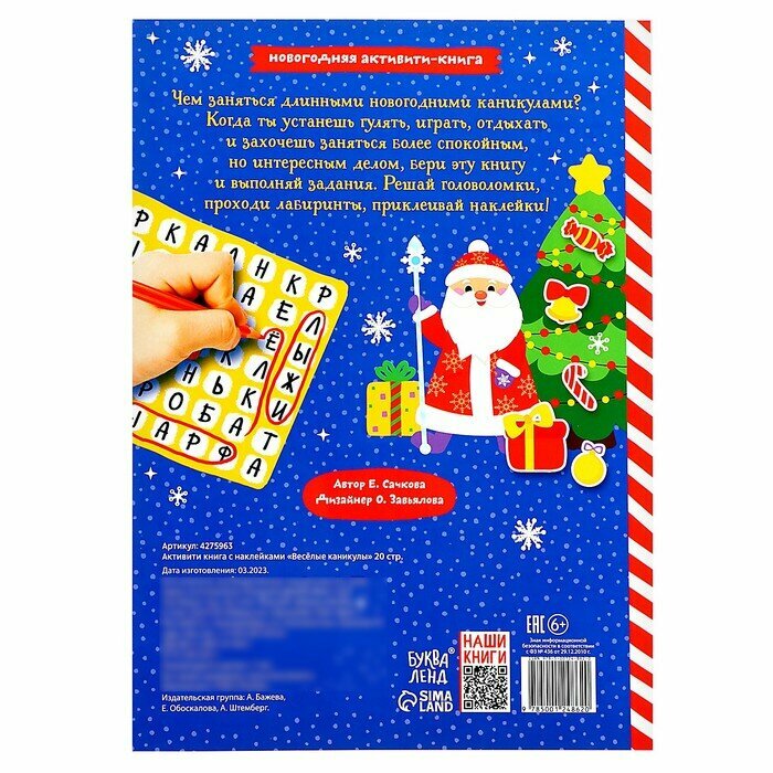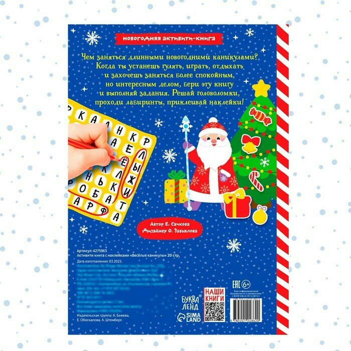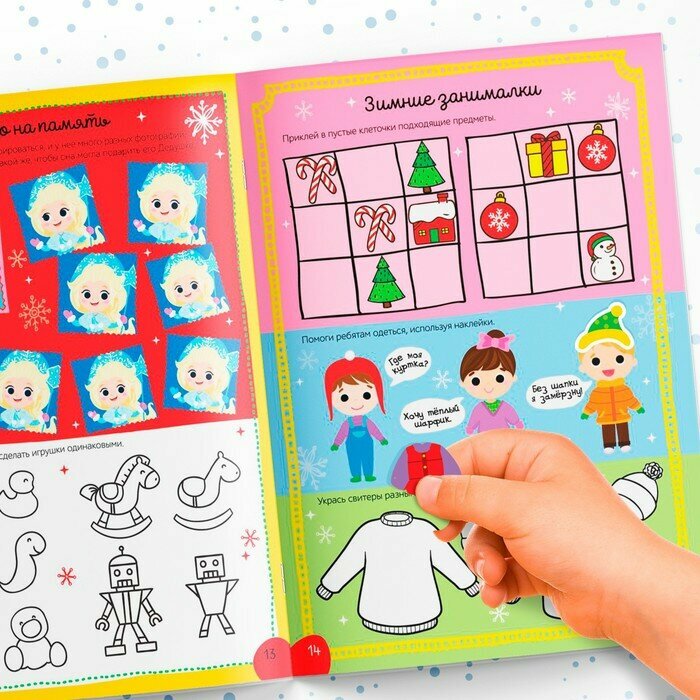 Активити-книжка с наклейками разнообразит каникулы малыша и увлечёт в мир весёлых заданий и головоломок. С её помощью ребёнок напишет письмо Деду Морозу, придумает дизайн зимней одежды и решит занимательные IQ-задачки.