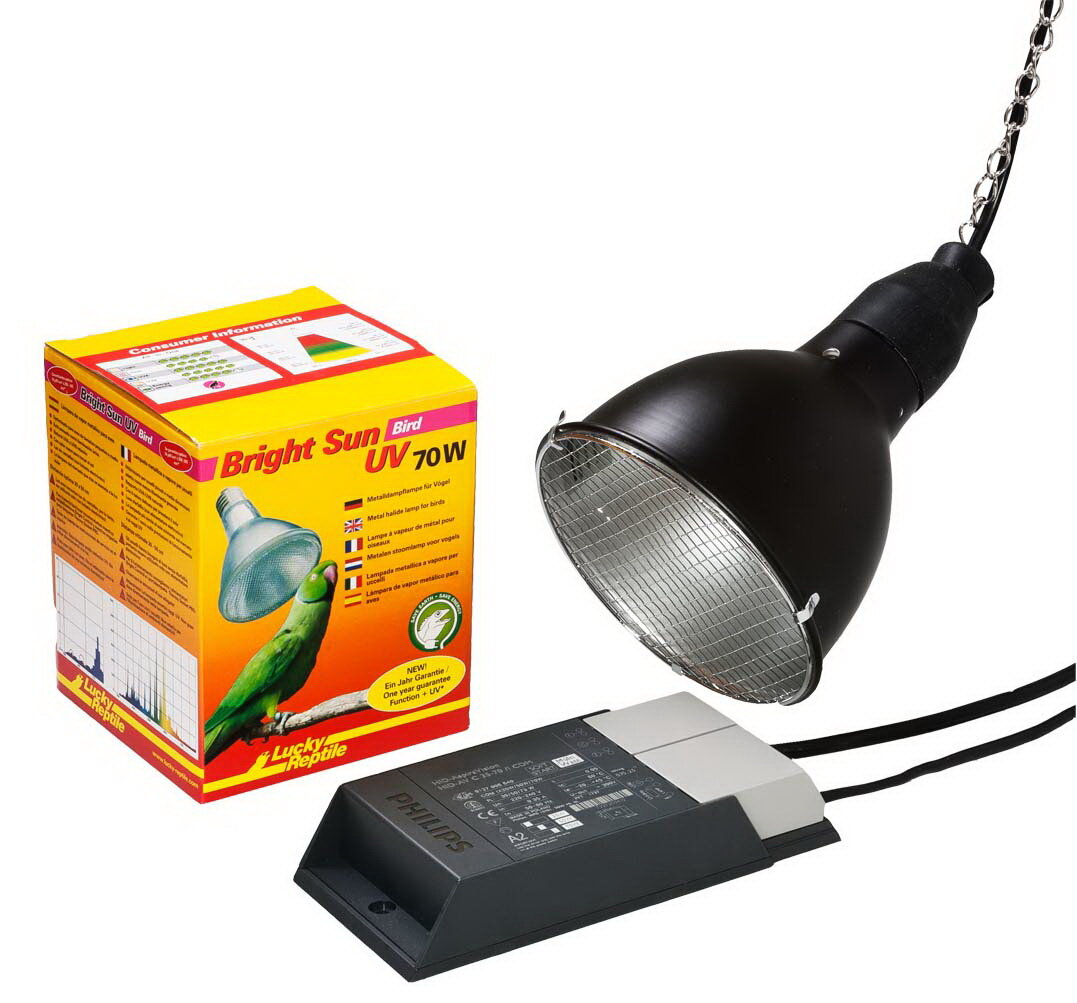 Помимо лампы Bight Sun UV Bird 70 Вт вы получаете электронное пускорегулирующее устройство Bright Control EVO, которое гарантирует свет без мерцания и светильник Thermo Socket plus Reflector PRO, который предотвращает прямой контакт птиц или людей с лампой и может быть легко подвешен, с помощью прилагаемой цепи, к потолку над клеткой птицы.