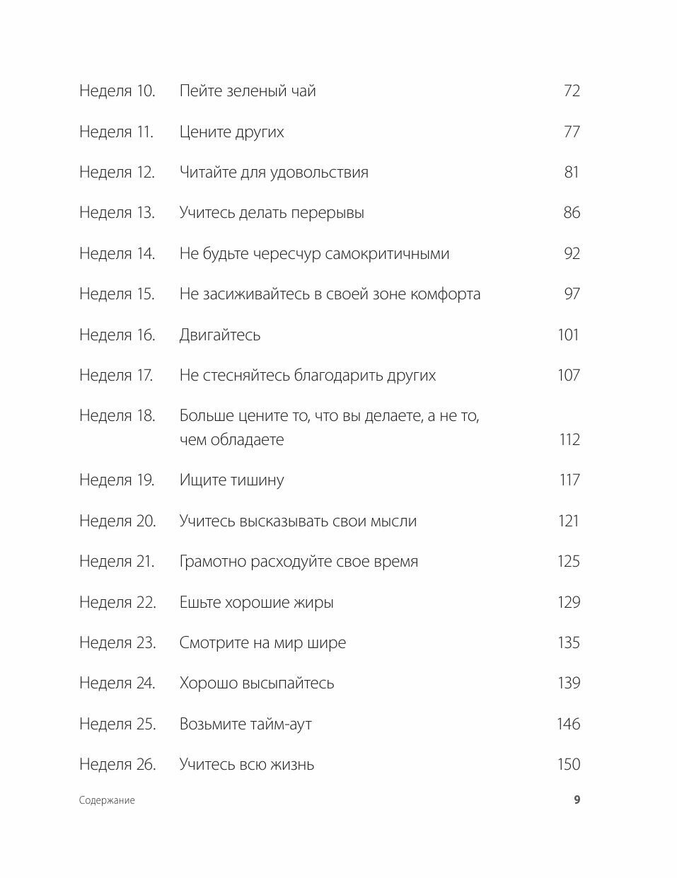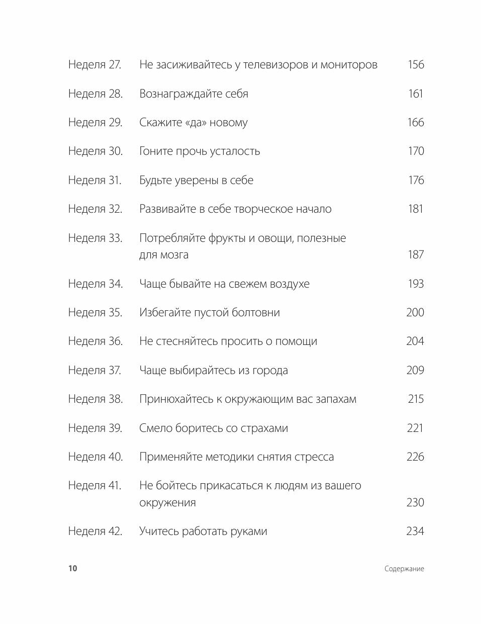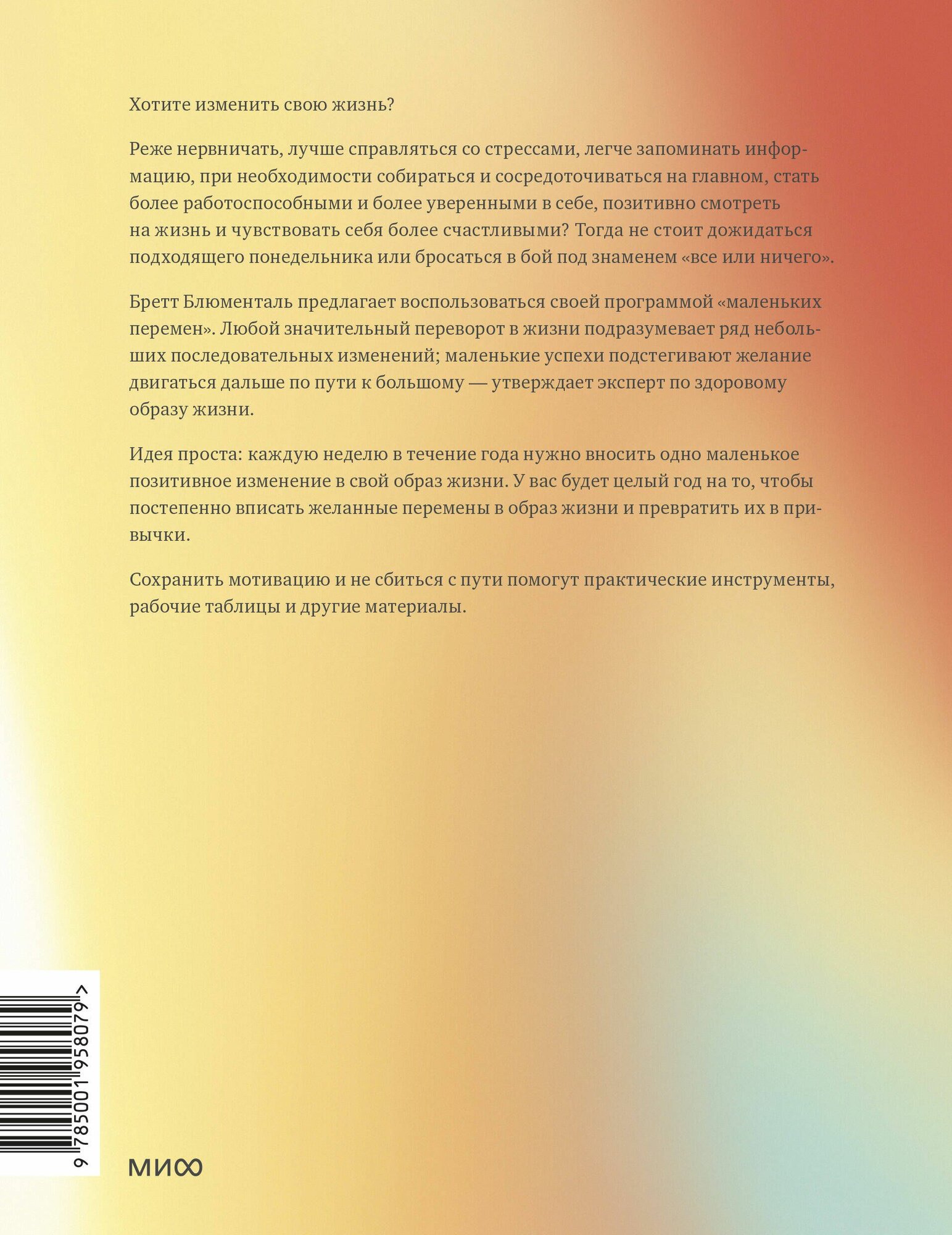 Идея книги проста: на протяжении 52 недель каждую неделю добивайтесь одного маленького позитивного изменения в образе вашей жизни, и к концу года вы будете менее подвержены воздействию стрессов, станете более работоспособными, будете больше запоминать, защитите себя от болезней и процесса старения и будете ощущать вашу жизнь более наполненной и разнообразной. Изложенная в этой книге программа дает вам целый год на то, чтобы постепенно достигнуть изменений, которые со временем впишутся в ваш образ жизни и станут для вас привычными. Следовательно, повышаются шансы того, что позитивные изменения в вашей жизни будут носить долговременный и постоянный характер.