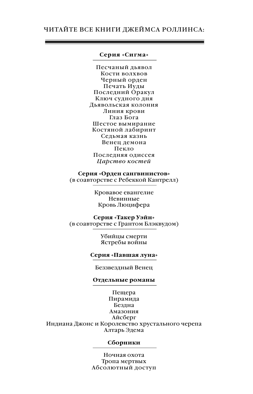Джеймс Роллинс – самый продаваемый автор приключенческих триллеров, создатель многочисленных бестселлеров №1 по версии «New York Times», разошедшихся по всему миру тиражом 20 миллионов экземпляров и переведенных на 40 языков.