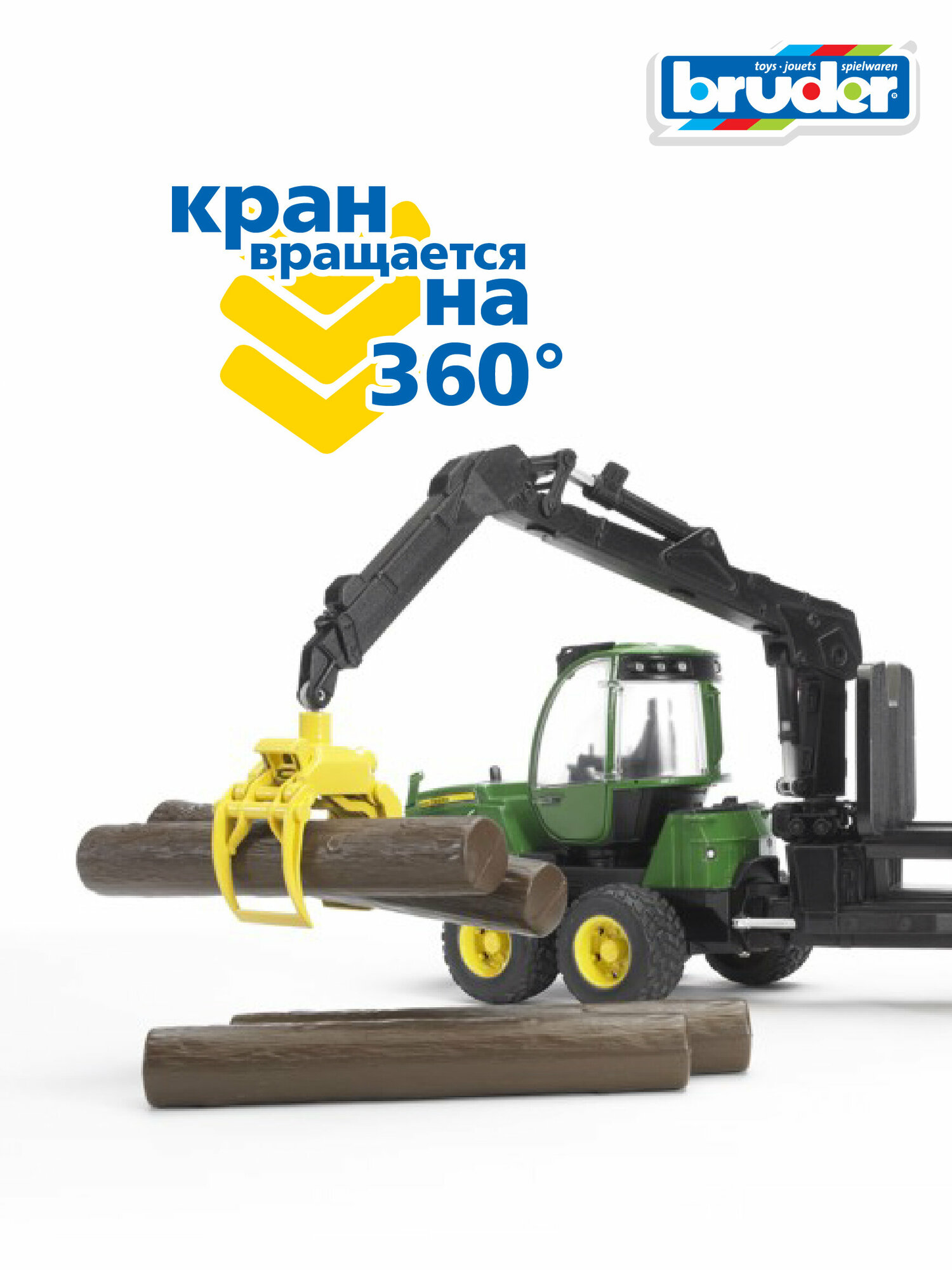- Трактор John Deere 1210E с прицепом с манипулятором и брёвнами Bruder 02-133 02133