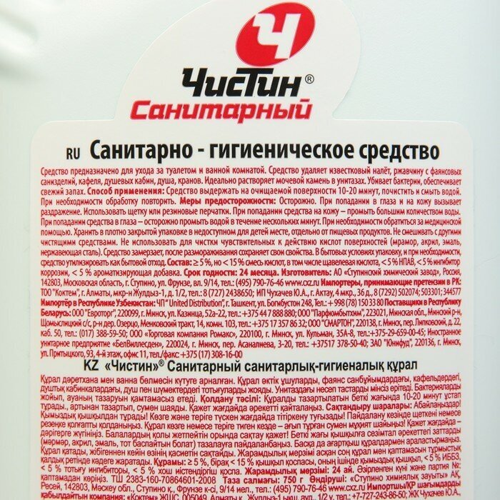 Средство для санитарных комнат «Чистин. Санитарный» предназначено для ухода за туалетом и ванной комнаты. Он эффективно удаляет известковый налет и ржавчину с фаянсовых санизделий, кафеля, душевых кабин, душа, кранов, растворяет мочевой камень и убивает бактерии. В составе средства содержится щавелевая кислота, поэтому при работе с продуктом обязательно используйте щетку или резиновые перчатки.