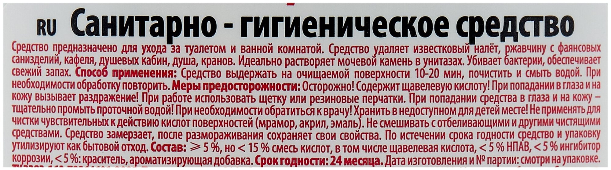 Средство для ухода за туалетом и ванной комнатой. Удаляет известковый налет и ржавчину. Растворяет мочевой камень. Убивает бактерии. Обеспечивает свежий запах. Подходит дляфаянсовых изделий, кафеля, душевых кабин, кранов, душа. Не содержит хлор.
