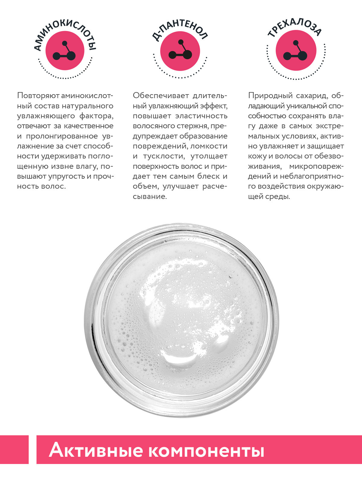 - Аминокислоты повторяют аминокислотный состав натурального увлажняющего фактора, отвечают за качественное и пролонгированное увлажнение за счет способности удерживать поглощенную извне влагу, повышают упругость и прочность волос.