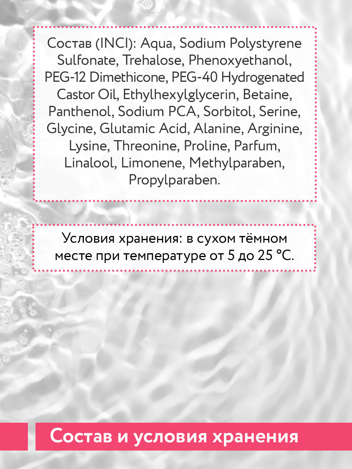 Состав: aqua, sodium polystyrene sulfonate, trehalose, phenoxyethanol, peg-12 dimethicone, peg-40 hydrogenated castor oil, ethylhexylglycerin, betaine, panthenol, sodium pca, sorbitol, serine, glycine, glutamic acid, alanine, arginine, lysine, threonine, proline, parfum, linalool, limonene, methylparaben, propylparaben
