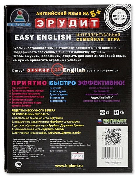 Биплант Эрудит Easy English – занимательная и простая логическая игра для всей семьи. С ее помощью, как взрослые, так и дети смогут легко и непринужденно изучать английский язык. В игровой форме вы будете поддерживать свои знания, расширите свой словарный запас, выучите новые слова и научитесь свободно общаться, не боясь языкового барьера. В ходе игры участникам нужно будет составлять слова из имеющихся букв. При этом вы должны занимать выгодные клетки и мешать ходу противника.