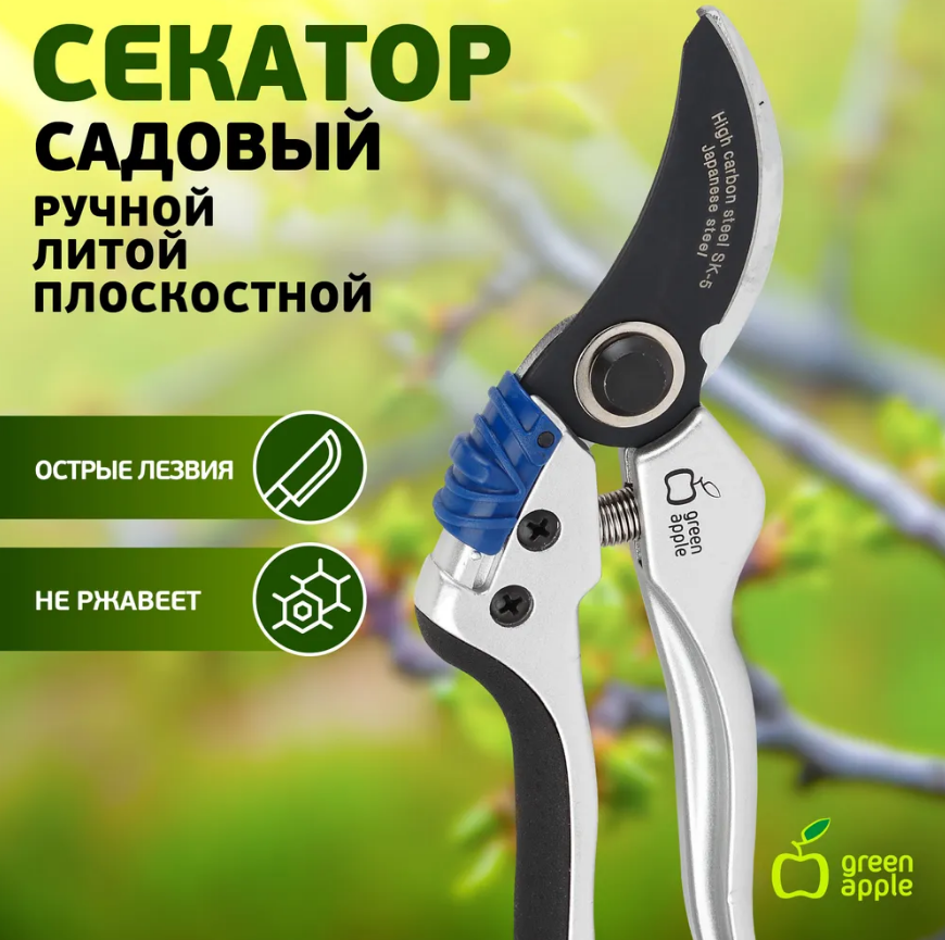 Плоскостной секатор GREEN APPLE предназначен для аккуратной обрезки молодых побегов, зеленых веток и цветов.