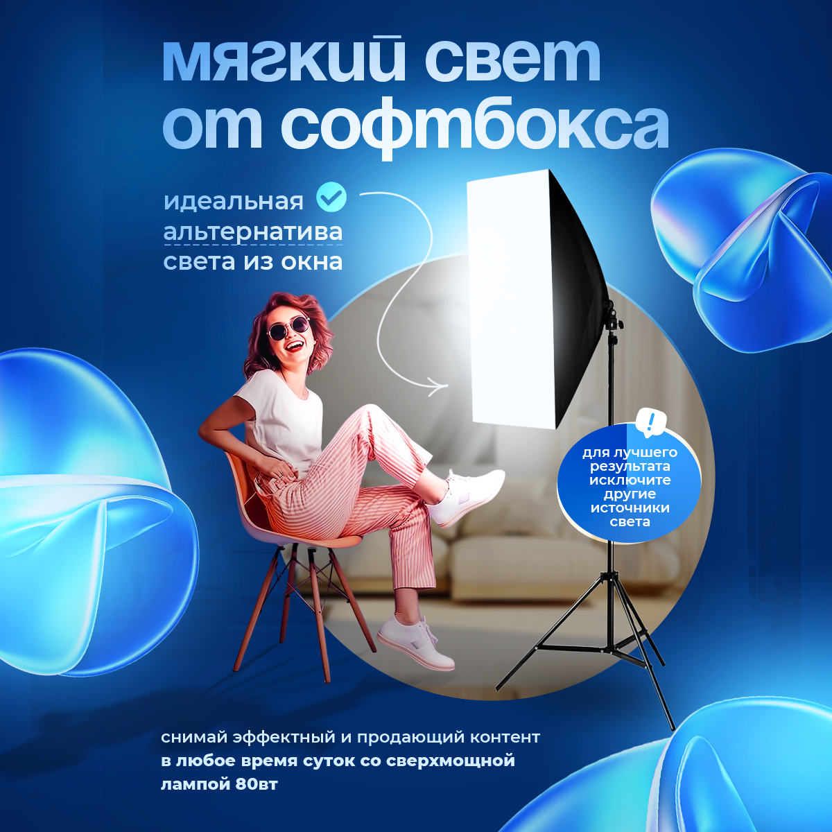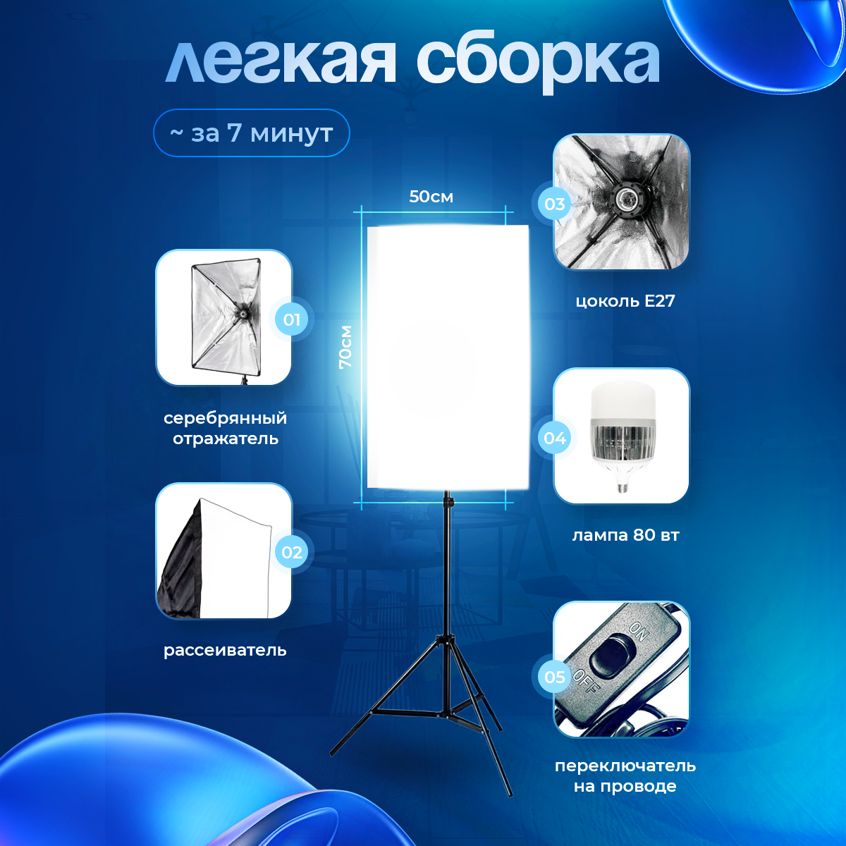 Видеосвет софтбокс прямоугольной формы 50х70 см с держателем для одной лампы на 80 Вт (цоколь Е27). Изготовлен из прочных металлических спиц и включает лампу, состоящую из внутреннего серебристого отражателя и наружного белого рассеивателя, которые крепятся на липучках. Этот видеосвет станет отличной заменой студийному оборудованию, обеспечивая равномерную подсветку и эффективный мягкий свет. Комплектация - Софтбокс - Штатив (70-200 см) - LED лампа 80 Вт Характеристики - Питание: 220 В - Разъем для LED лампы: E27 - Размеры: ширина 16 см, высота 16 см, длина 70 см - Вес: 1,7 кг ✨ Преимущества - Универсальность: подходит для видео, фотосессий, TikTok роликов и создания профессионального контента. - Портативность: легко перемещается между комнатами. - Регулируемая высота: позволяет настроить уровень освещения под свои потребности. Создай уникальные композиции С этим видеосветом хорошо освещенные кадры станут реальностью. Позволь своему творчеству расцвести, и создавай достойные шедевры в любом месте! Закажи сейчас и преображай свои съемки!